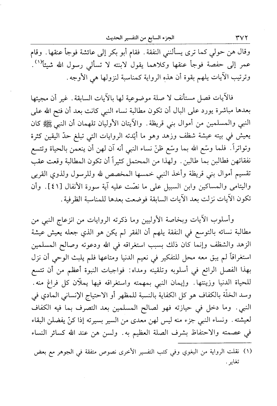 وسد الخلّة بالكفاف هو كل الكفاية بالنسبة للمظهر أو الاحتياج الإنساني المادي في النبي. وما دخل في حيازته فهو لصالح المسلمين بعد التصرف بما فيه الكفاف لعيشته. ونساء النبي جزء منه ليس لهن معدى من السير بسيرته إذا كنّ يفضلن البقاء في عصمته والاحتفاظ بشرف الصلة العظيم به. ولسن هن عند الله كسائر النساء