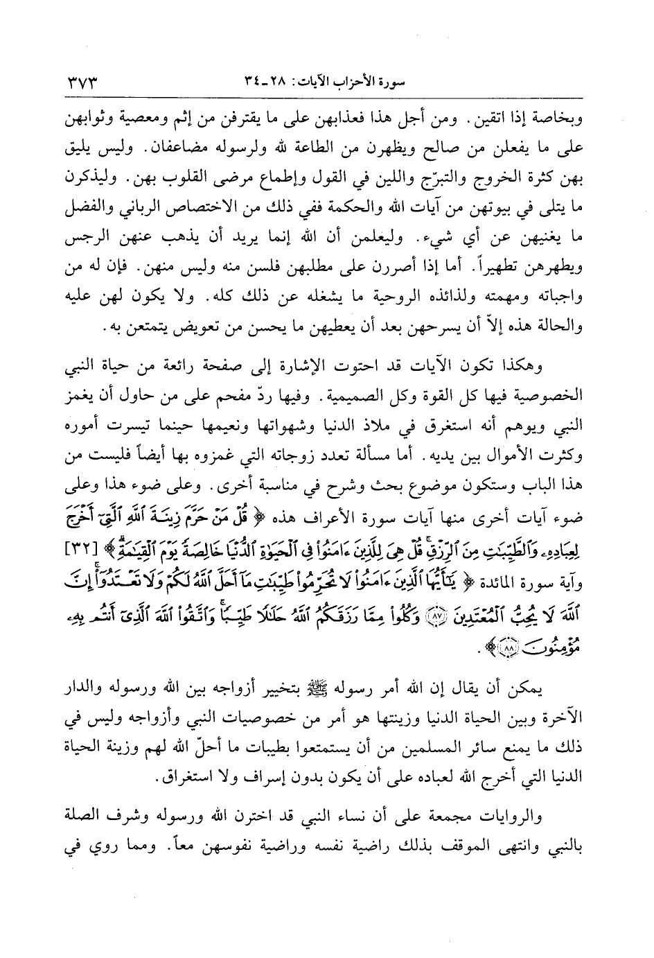 يمكن أن يقال إن الله أمر رسوله صلى الله عليه وسلم بتخيير أزواجه بين الله ورسوله والدار الآخرة وبين الحياة الدنيا وزينتها هو أمر من خصوصيات النبي وأزواجه وليس في ذلك ما يمنع سائر المسلمين من أن يستمتعوا بطيبات ما أحلّ الله لهم وزينة الحياة الدنيا التي أخرج الله لعباده على أن يكون بدون إسراف ولا استغراق.