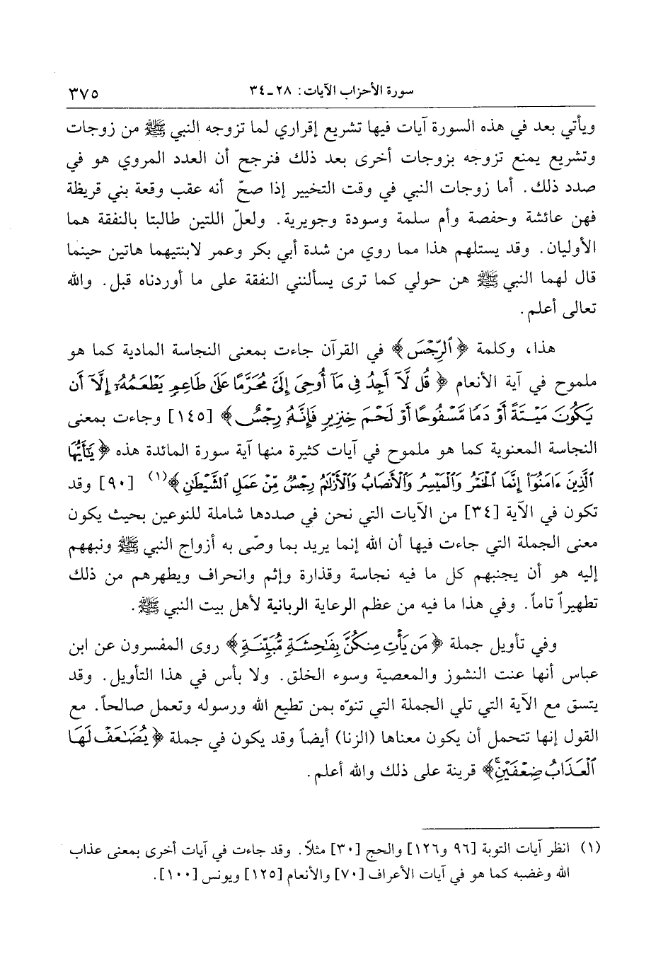 هذا، وكلمة الرِّجْسَ في القرآن جاءت بمعنى النجاسة المادية كما هو ملموح في آية الأنعام قُلْ لا أَجِدُ فِي ما أُوحِيَ إِلَيَّ مُحَرَّماً عَلى طاعِمٍ يَطْعَمُهُ إِلَّا أَنْ يَكُونَ مَيْتَةً أَوْ دَماً مَسْفُوحاً أَوْ لَحْمَ خِنزِيرٍ فَإِنَّهُ رِجْسٌ [145] وجاءت بمعنى النجاسة المعنوية كما هو ملموح في آيات كثيرة منها آية سورة المائدة هذه يا أَيُّهَا الَّذِينَ آمَنُوا إِنَّمَا الْخَمْرُ وَالْمَيْسِرُ وَالْأَنْصابُ وَالْأَزْلامُ رِجْسٌ مِنْ عَمَلِ الشَّيْطانِ «1» [90] وقد تكون في الآية [34] من الآيات التي نحن في صددها شاملة للنوعين بحيث يكون معنى الجملة التي جاءت فيها أن الله إنما يريد بما وصّى به أزواج النبي صلى الله عليه وسلم ونبههم إليه هو أن يجنبهم كل ما فيه نجاسة وقذارة وإثم وانحراف ويطهرهم من ذلك تطهيرا تاما. وفي هذا ما فيه من عظم الرعاية الربانية لأهل بيت النبي صلى الله عليه وسلم.