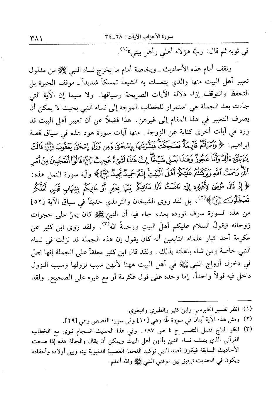 ونقف أمام هذه الأحاديث- وبخاصة أمام ما يخرج نساء النبي صلى الله عليه وسلم من مدلول تعبير أهل البيت ومنها والذي يتمسك به الشيعة تمسكا شديدا- موقف الحيرة بل التحفظ والتوقف إزاء دلالة الآيات الصريحة وسياقها. ولا سيما إن الآية التي جاءت بعد الجملة هي استمرار للخطاب الموجه إلى نساء النبي بحيث لا يمكن أن يصرف التعبير في هذا المقام إلى غيرهن. هذا فضلا عن أن تعبير أهل البيت قد ورد في آيات أخرى كناية عن الزوجة. منها آيات سورة هود هذه في سياق قصة إبراهيم: وَامْرَأَتُهُ قائِمَةٌ فَضَحِكَتْ فَبَشَّرْناها بِإِسْحاقَ وَمِنْ وَراءِ إِسْحاقَ يَعْقُوبَ (71) قالَتْ يا وَيْلَتى أَأَلِدُ وَأَنَا عَجُوزٌ وَهذا بَعْلِي شَيْخاً إِنَّ هذا لَشَيْءٌ عَجِيبٌ (72) قالُوا أَتَعْجَبِينَ مِنْ أَمْرِ اللَّهِ رَحْمَتُ اللَّهِ وَبَرَكاتُهُ عَلَيْكُمْ أَهْلَ الْبَيْتِ إِنَّهُ حَمِيدٌ مَجِيدٌ