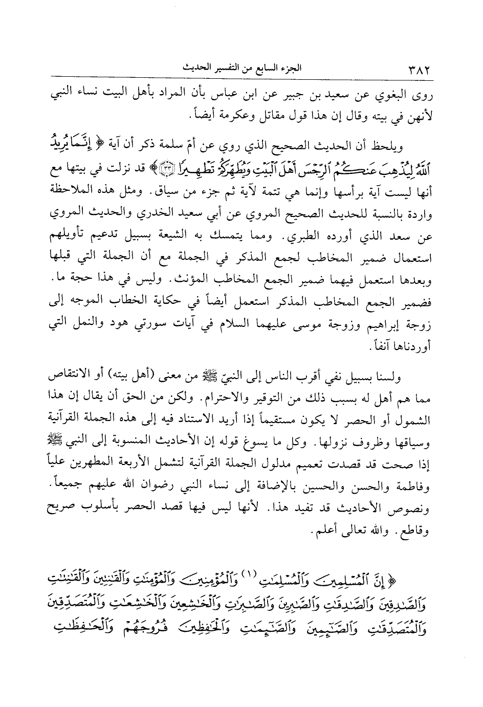 ولسنا بسبيل نفي أقرب الناس إلى النبيّ صلى الله عليه وسلم من معنى (أهل بيته) أو الانتقاص مما هم أهل له بسبب ذلك من التوقير والاحترام. ولكن من الحق أن يقال إن هذا الشمول أو الحصر لا يكون مستقيما إذا أريد الاستناد فيه إلى هذه الجملة القرآنية وسياقها وظروف نزولها. وكل ما يسوغ قوله إن الأحاديث المنسوبة إلى النبي صلى الله عليه وسلم إذا صحت قد قصدت تعميم مدلول الجملة القرآنية لتشمل الأربعة المطهرين عليا وفاطمة والحسن والحسين بالإضافة إلى نساء النبي رضوان الله عليهم جميعا.