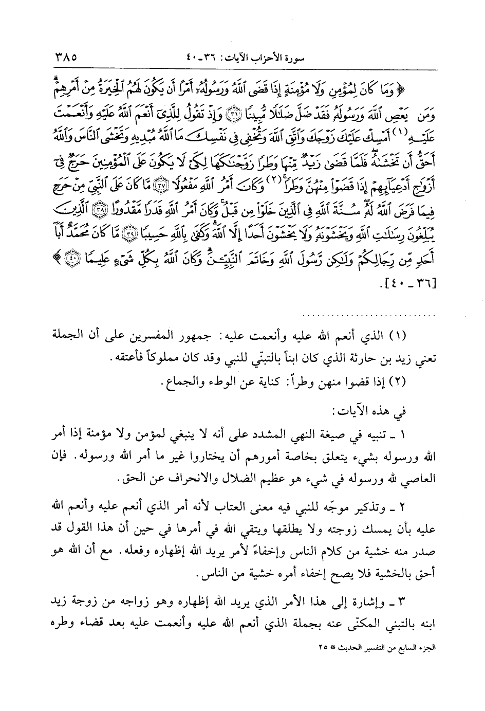وَما كانَ لِمُؤْمِنٍ وَلا مُؤْمِنَةٍ إِذا قَضَى اللَّهُ وَرَسُولُهُ أَمْراً أَنْ يَكُونَ لَهُمُ الْخِيَرَةُ مِنْ أَمْرِهِمْ وَمَنْ يَعْصِ اللَّهَ وَرَسُولَهُ فَقَدْ ضَلَّ ضَلالاً مُبِيناً (36) وَإِذْ تَقُولُ لِلَّذِي أَنْعَمَ اللَّهُ عَلَيْهِ وَأَنْعَمْتَ عَلَيْهِ أَمْسِكْ عَلَيْكَ زَوْجَكَ وَاتَّقِ اللَّهَ وَتُخْفِي فِي نَفْسِكَ مَا اللَّهُ مُبْدِيهِ وَتَخْشَى النَّاسَ وَاللَّهُ أَحَقُّ أَنْ تَخْشاهُ فَلَمَّا قَضى زَيْدٌ مِنْها وَطَراً زَوَّجْناكَها لِكَيْ لا يَكُونَ عَلَى الْمُؤْمِنِينَ حَرَجٌ فِي أَزْواجِ أَدْعِيائِهِمْ إِذا قَضَوْا مِنْهُنَّ وَطَراً وَكانَ أَمْرُ اللَّهِ مَفْعُولاً (37) ما كانَ عَلَى النَّبِيِّ مِنْ حَرَجٍ فِيما فَرَضَ اللَّهُ لَهُ سُنَّةَ اللَّهِ فِي الَّذِينَ خَلَوْا مِنْ قَبْلُ وَكانَ أَمْرُ اللَّهِ قَدَراً مَقْدُوراً (38) الَّذِينَ يُبَلِّغُونَ رِسالاتِ اللَّهِ وَيَخْشَوْنَهُ وَلا يَخْشَوْنَ أَحَداً إِلاَّ اللَّهَ وَكَفى بِاللَّهِ حَسِيباً (39) ما كانَ مُحَمَّدٌ أَبا أَحَدٍ مِنْ رِجالِكُمْ وَلكِنْ رَسُولَ اللَّهِ وَخاتَمَ النَّبِيِّينَ وَكانَ اللَّهُ بِكُلِّ شَيْءٍ عَلِيماً (40)