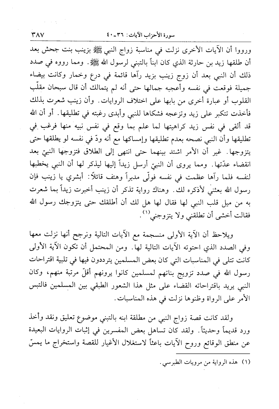 ولقد كانت قصة زواج النبي من مطلقة ابنه بالتبني موضوع تعليق ونقد وأخذ ورد قديما وحديثا. ولقد كان تساهل بعض المفسرين في إثبات الروايات البعيدة عن منطق الوقائع وروح الآيات باعثا لاستغلال الأغيار للقصة واستخراج ما يمسّ