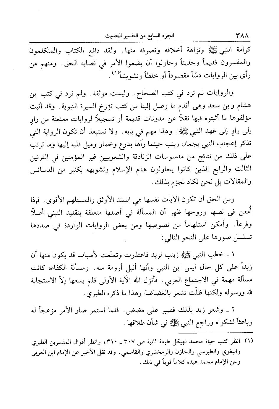 (1) انظر كتب حياة محمد لهيكل طبعة ثانية ص 307- 310، وانظر أقوال المفسرين الطبري والبغوي والطبرسي والخازن والزمخشري والقاسمي. وقد نقل الأخير عن الإمام ابن العربي وعن الإمام محمد عبده كلاما قويا في ذلك.
