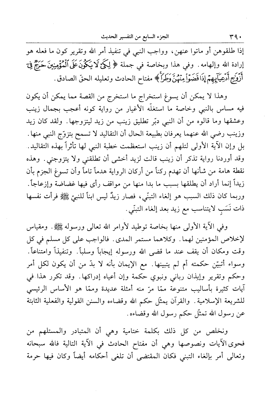 إذا طلقوهن أو ماتوا عنهن، وواجب النبي في تنفيذ أمر الله وتقرير كون ما فعله هو إرادة الله وإلهامه. وفي هذا وبخاصة في جملة لِكَيْ لا يَكُونَ عَلَى الْمُؤْمِنِينَ حَرَجٌ فِي أَزْواجِ أَدْعِيائِهِمْ إِذا قَضَوْا مِنْهُنَّ وَطَراً مفتاح الحادث وتعليله الحقّ الصادق.