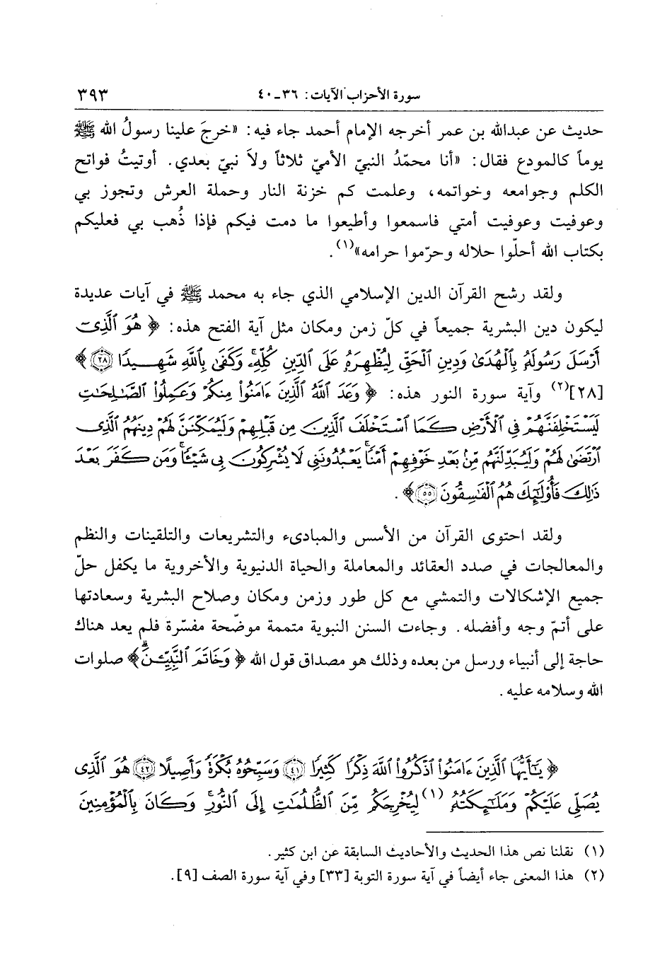 ولقد احتوى القرآن من الأسس والمبادئ والتشريعات والتلقينات والنظم والمعالجات في صدد العقائد والمعاملة والحياة الدنيوية والأخروية ما يكفل حلّ جميع الإشكالات والتمشي مع كل طور وزمن ومكان وصلاح البشرية وسعادتها على أتمّ وجه وأفضله. وجاءت السنن النبوية متممة موضّحة مفسّرة فلم يعد هناك حاجة إلى أنبياء ورسل من بعده وذلك هو مصداق قول الله وَخاتَمَ النَّبِيِّينَ صلوات الله وسلامه عليه.