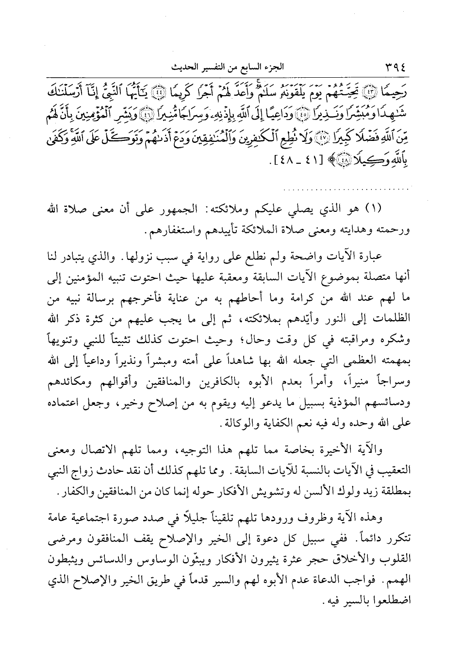 عبارة الآيات واضحة ولم نطلع على رواية في سبب نزولها. والذي يتبادر لنا أنها متصلة بموضوع الآيات السابقة ومعقبة عليها حيث احتوت تنبيه المؤمنين إلى ما لهم عند الله من كرامة وما أحاطهم به من عناية فأخرجهم برسالة نبيه من الظلمات إلى النور وأيّدهم بملائكته، ثم إلى ما يجب عليهم من كثرة ذكر الله وشكره ومراقبته في كل وقت وحال وحيث احتوت كذلك تثبيتا للنبي وتنويها بمهمته العظمى التي جعله الله بها شاهدا على أمته ومبشرا ونذيرا وداعيا إلى الله وسراجا منيرا، وأمرا بعدم الأبوه بالكافرين والمنافقين وأقوالهم ومكائدهم ودسائسهم المؤذية بسبيل ما يدعو إليه ويقوم به من إصلاح وخير، وجعل اعتماده على الله وحده وله فيه نعم الكفاية والوكالة.