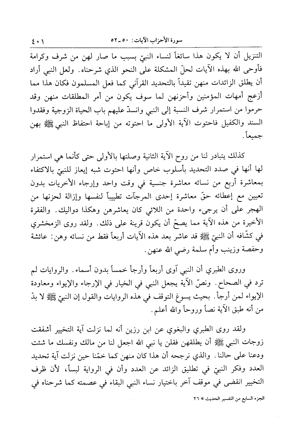 التنزيل أن لا يكون هذا سائغا لنساء النبيّ بسبب ما صار لهن من شرف وكرامة فأوحى الله بهذه الآيات لحلّ المشكلة على النحو الذي شرحناه. ولعل النبي أراد أن يطلق الزائدات منهن تقيدا بالتحديد القرآني كما فعل المسلمون فكان هذا مما أزعج أمهات المؤمنين وأحزنهن لما سوف يكون من أمر المطلقات منهن وقد حرموا من استمرار شرف النسبة إلى النبي وانسدّ عليهم باب الحياة الزوجية وفقدوا السند والكفيل فاحتوت الآية الأولى ما احتوته من إباحة احتفاظ النبي صلى الله عليه وسلم بهن جميعا.