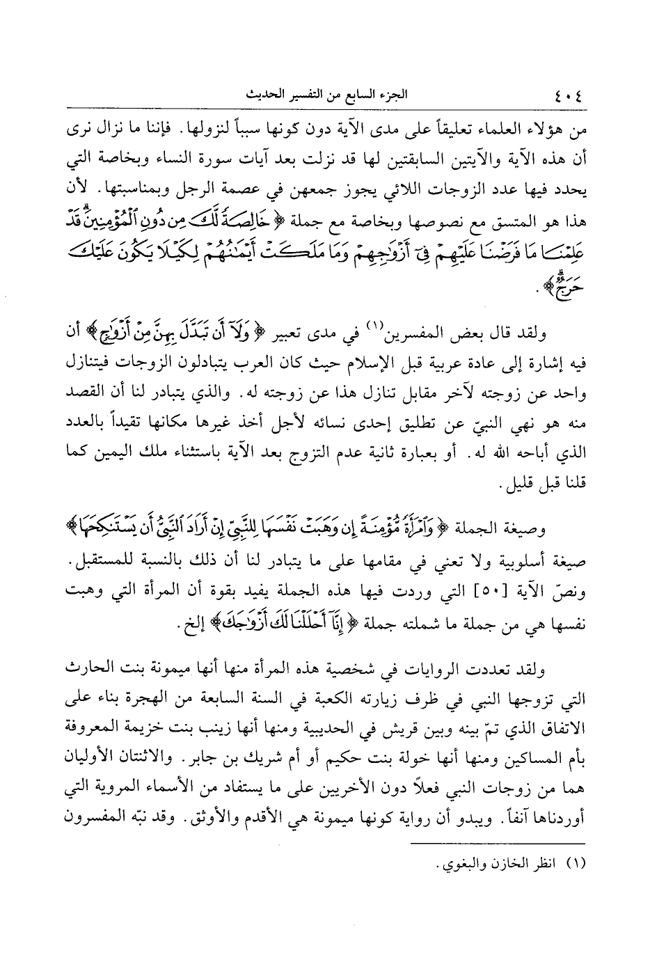 من هؤلاء العلماء تعليقا على مدى الآية دون كونها سببا لنزولها. فإننا ما نزال نرى أن هذه الآية والآيتين السابقتين لها قد نزلت بعد آيات سورة النساء وبخاصة التي يحدد فيها عدد الزوجات اللائي يجوز جمعهن في عصمة الرجل وبمناسبتها. لأن هذا هو المتسق مع نصوصها وبخاصة مع جملة خالِصَةً لَكَ مِنْ دُونِ الْمُؤْمِنِينَ قَدْ عَلِمْنا ما فَرَضْنا عَلَيْهِمْ فِي أَزْواجِهِمْ وَما مَلَكَتْ أَيْمانُهُمْ لِكَيْلا يَكُونَ عَلَيْكَ حَرَجٌ.