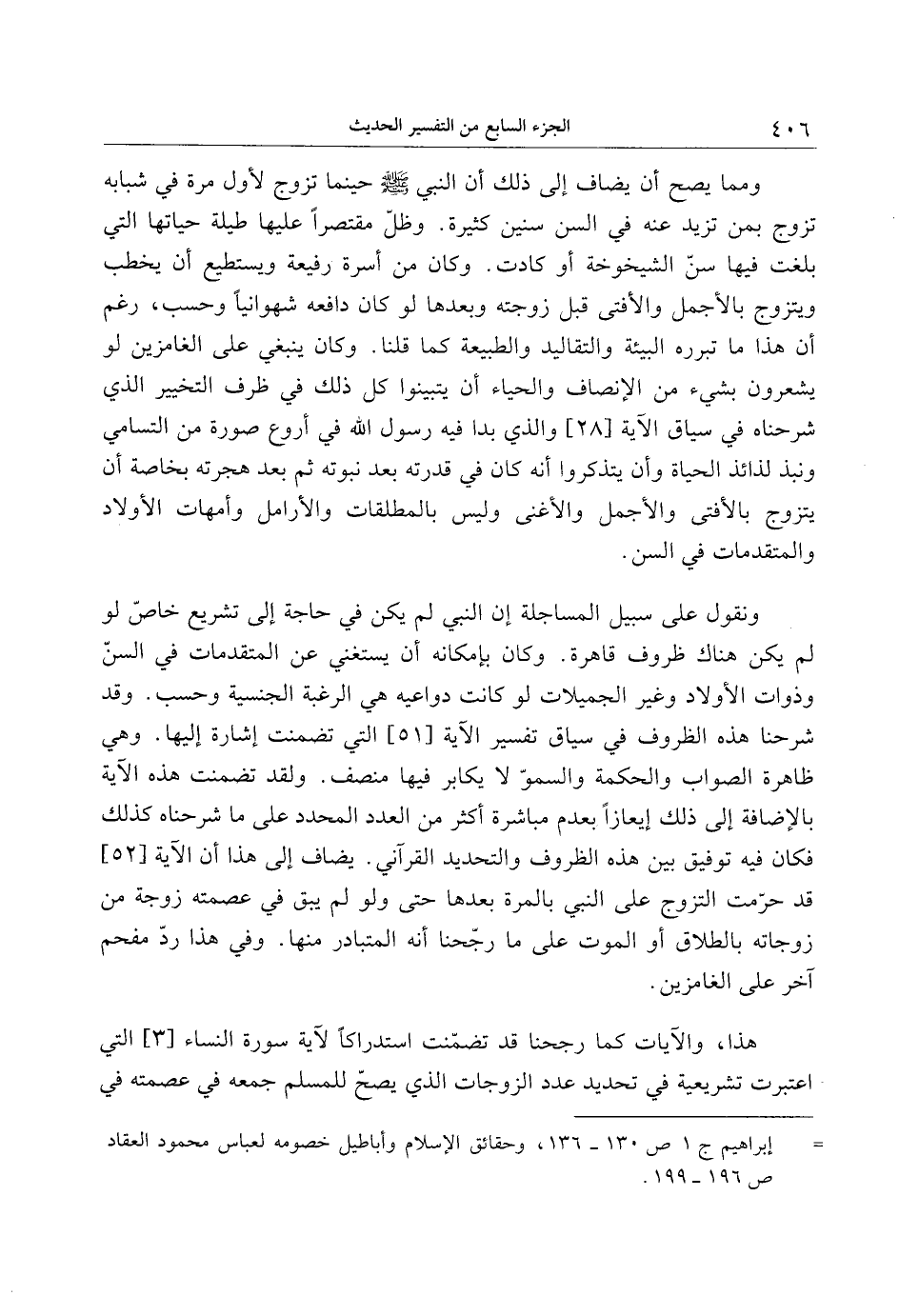 ومما يصح أن يضاف إلى ذلك أن النبي صلى الله عليه وسلم حينما تزوج لأول مرة في شبابه تزوج بمن تزيد عنه في السن سنين كثيرة. وظلّ مقتصرا عليها طيلة حياتها التي بلغت فيها سنّ الشيخوخة أو كادت. وكان من أسرة رفيعة ويستطيع أن يخطب ويتزوج بالأجمل والأفتى قبل زوجته وبعدها لو كان دافعه شهوانيا وحسب، رغم أن هذا ما تبرره البيئة والتقاليد والطبيعة كما قلنا. وكان ينبغي على الغامزين لو يشعرون بشيء من الإنصاف والحياء أن يتبينوا كل ذلك في ظرف التخيير الذي شرحناه في سياق الآية [28] والذي بدا فيه رسول الله في أروع صورة من التسامي ونبذ لذائذ الحياة وأن يتذكروا أنه كان في قدرته بعد نبوته ثم بعد هجرته بخاصة أن يتزوج بالأفتى والأجمل والأغنى وليس بالمطلقات والأرامل وأمهات الأولاد والمتقدمات في السن.