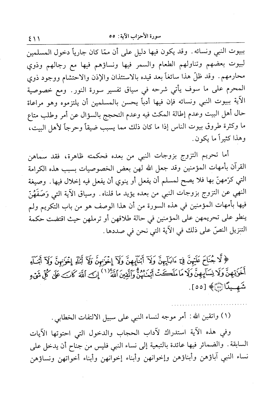 لا جُناحَ عَلَيْهِنَّ فِي آبائِهِنَّ وَلا أَبْنائِهِنَّ وَلا إِخْوانِهِنَّ وَلا أَبْناءِ إِخْوانِهِنَّ وَلا أَبْناءِ أَخَواتِهِنَّ وَلا نِسائِهِنَّ وَلا ما مَلَكَتْ أَيْمانُهُنَّ وَاتَّقِينَ اللَّهَ إِنَّ اللَّهَ كانَ عَلى كُلِّ شَيْءٍ شَهِيداً (55)