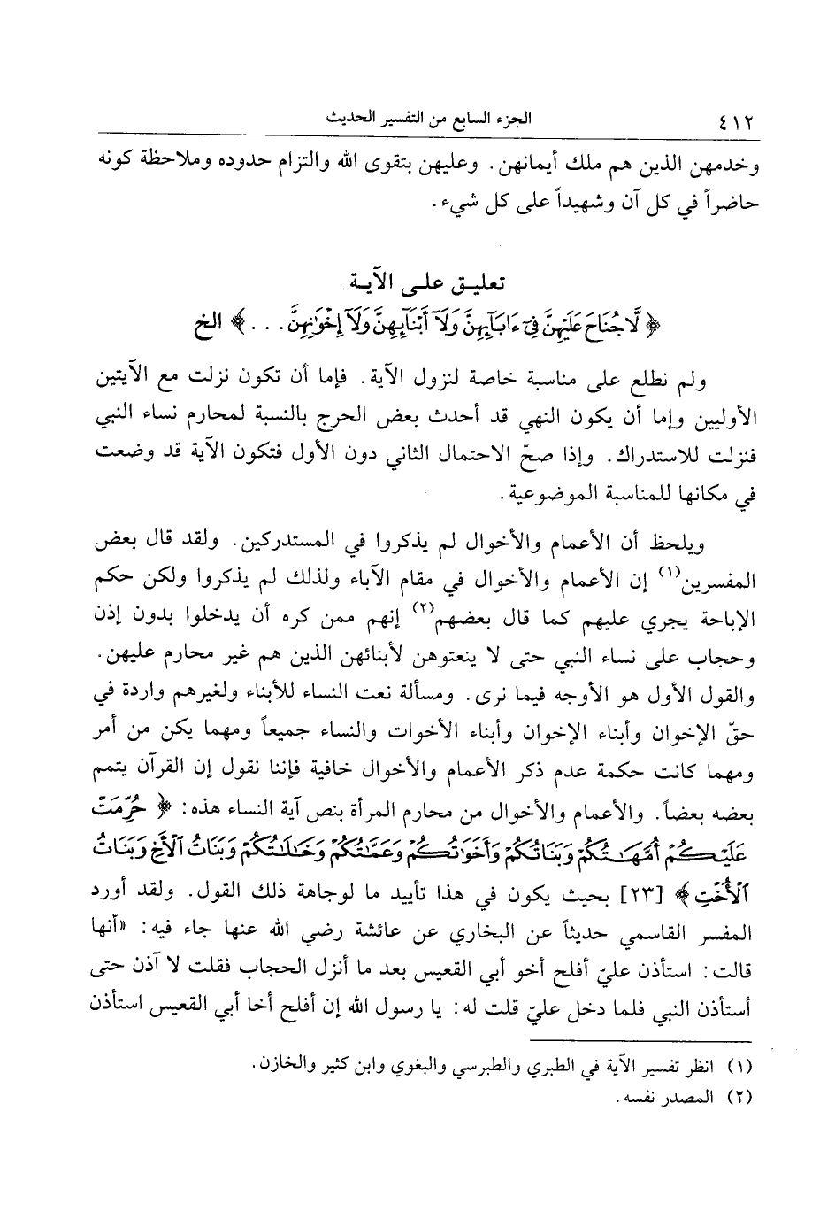 والقول الأول هو الأوجه فيما نرى. ومسألة نعت النساء للأبناء ولغيرهم واردة في حقّ الإخوان وأبناء الإخوان وأبناء الأخوات والنساء جميعا ومهما يكن من أمر ومهما كانت حكمة عدم ذكر الأعمام والأخوال خافية فإننا نقول إن القرآن يتمم بعضه بعضا. والأعمام والأخوال من محارم المرأة بنص آية النساء هذه: حُرِّمَتْ عَلَيْكُمْ أُمَّهاتُكُمْ وَبَناتُكُمْ وَأَخَواتُكُمْ وَعَمَّاتُكُمْ وَخالاتُكُمْ وَبَناتُ الْأَخِ وَبَناتُ الْأُخْتِ [23] بحيث يكون في هذا تأييد ما لوجاهة ذلك القول. ولقد أورد المفسر القاسمي حديثا عن البخاري عن عائشة رضي الله عنها جاء فيه: «أنها قالت: استأذن عليّ أفلح أخو أبي القعيس بعد ما أنزل الحجاب فقلت لا آذن حتى أستأذن النبي فلما دخل عليّ قلت له: يا رسول الله إن أفلح أخا أبي القعيس استأذن