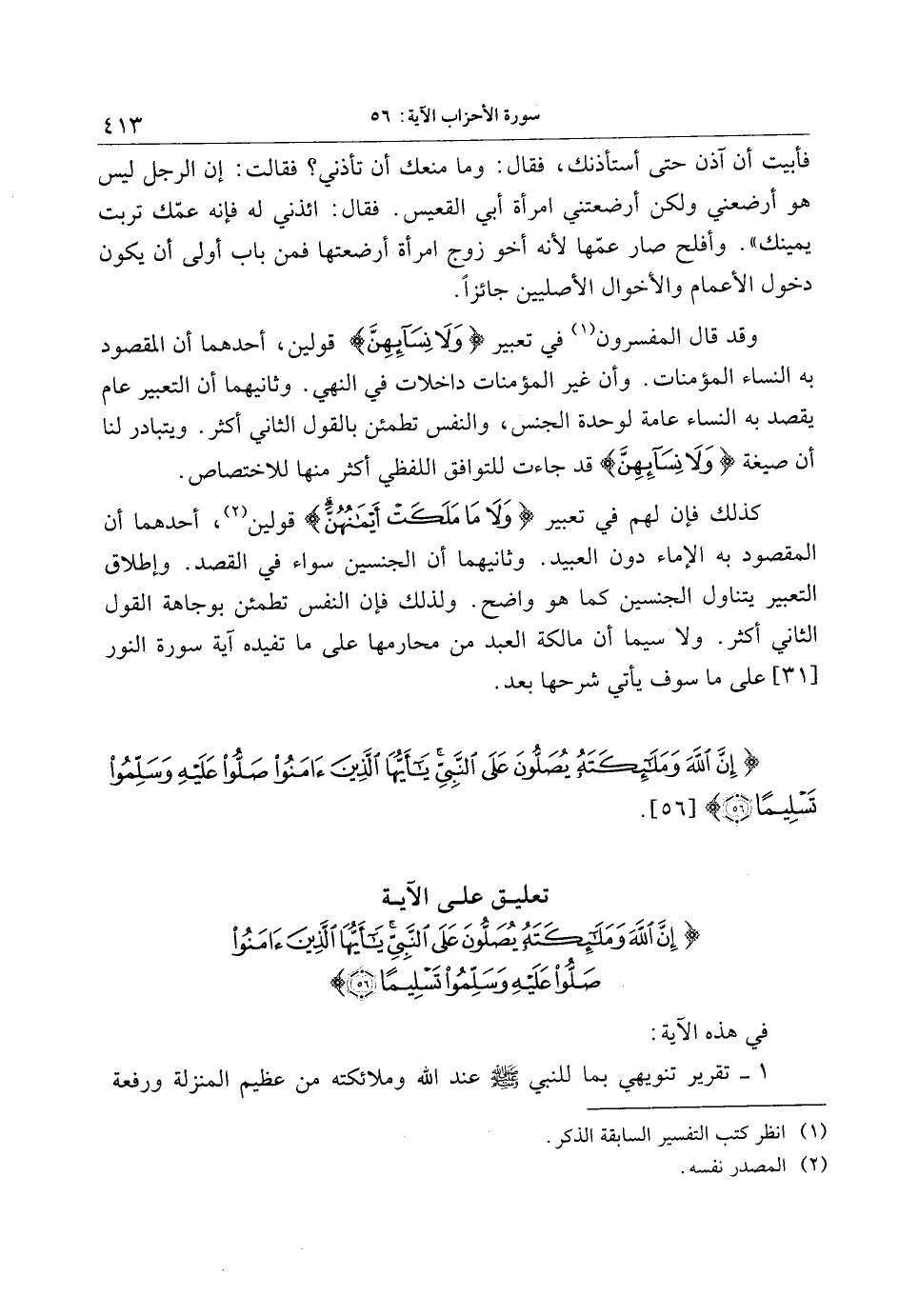. تعليق على الآية إِنَّ اللَّهَ وَمَلائِكَتَهُ يُصَلُّونَ عَلَى النَّبِيِّ يا أَيُّهَا الَّذِينَ آمَنُوا صَلُّوا عَلَيْهِ وَسَلِّمُوا تَسْلِيماً (56)
