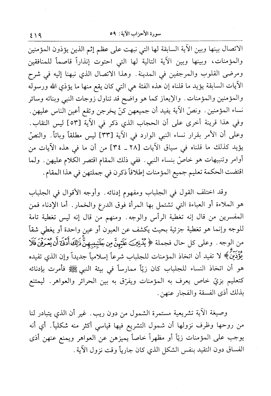 وصيغة الآية تشريعية مستمرة الشمول من دون ريب. غير أن الذي يتبادر لنا من روحها وظرف نزولها أن شمول التشريع فيها قياسي أكثر منه شكليا. أي أنه يوجب على المؤمنات زيّا أو مظهرا خاصا يميزهن عن العواهر ويمنع عنهن أذى الفساق دون التقيد بنفس الشكل الذي كان جاريا وقت نزول الآية.