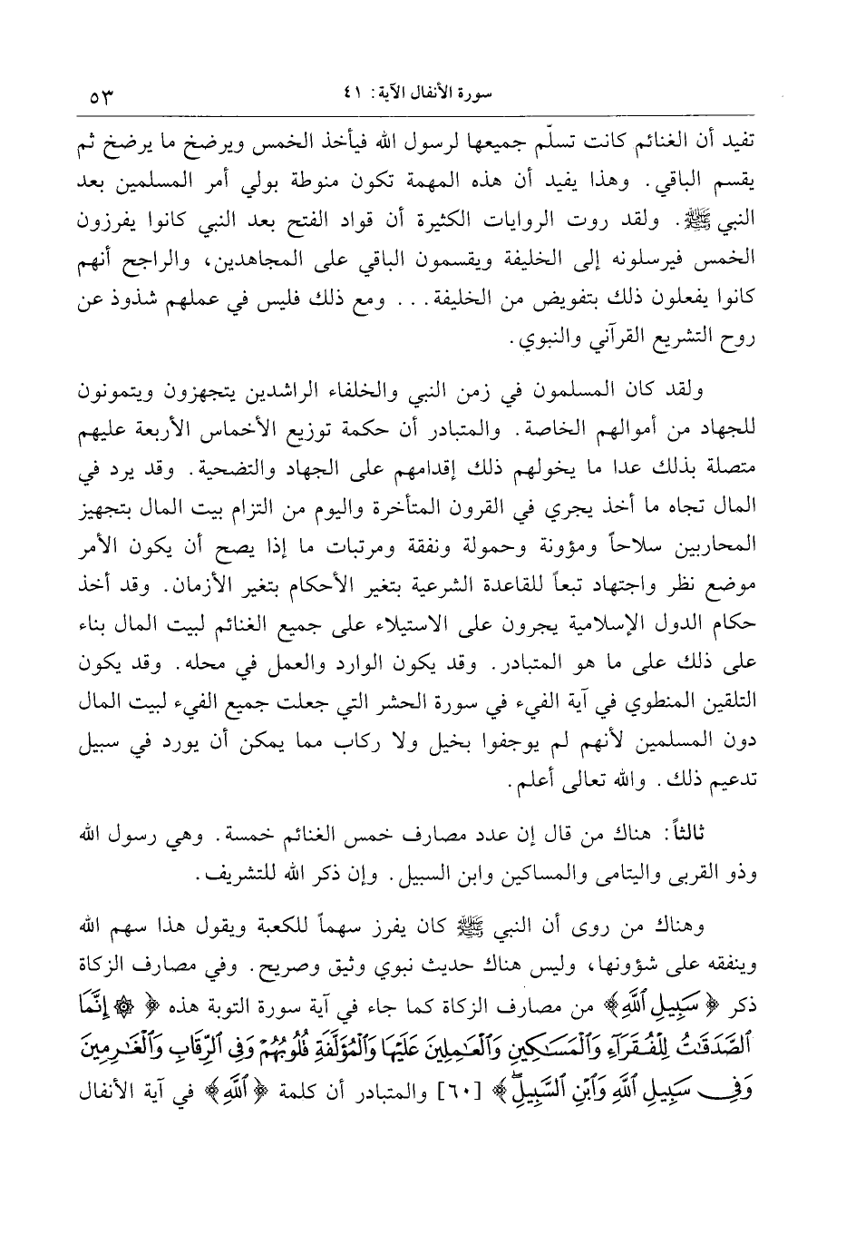 ولقد كان المسلمون في زمن النبي والخلفاء الراشدين يتجهزون ويتمونون للجهاد من أموالهم الخاصة. والمتبادر أن حكمة توزيع الأخماس الأربعة عليهم متصلة بذلك عدا ما يخولهم ذلك إقدامهم على الجهاد والتضحية. وقد يرد في المال تجاه ما أخذ يجري في القرون المتأخرة واليوم من التزام بيت المال بتجهيز المحاربين سلاحا ومؤونة وحمولة ونفقة ومرتبات ما إذا يصح أن يكون الأمر موضع نظر واجتهاد تبعا للقاعدة الشرعية بتغير الأحكام بتغير الأزمان. وقد أخذ حكام الدول الإسلامية يجرون على الاستيلاء على جميع الغنائم لبيت المال بناء على ذلك على ما هو المتبادر. وقد يكون الوارد والعمل في محله. وقد يكون التلقين المنطوي في آية الفيء في سورة الحشر التي جعلت جميع الفيء لبيت المال دون المسلمين لأنهم لم يوجفوا بخيل ولا ركاب مما يمكن أن يورد في سبيل تدعيم ذلك. والله تعالى أعلم.