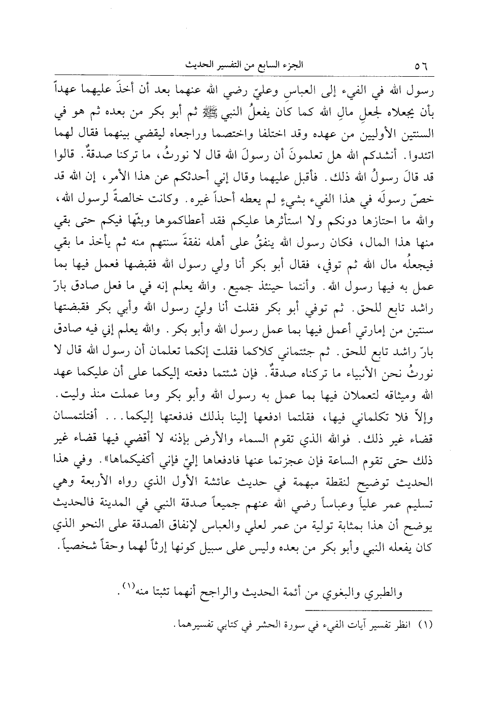 رسول الله في الفيء إلى العباس وعليّ رضي الله عنهما بعد أن أخذ عليهما عهدا بأن يجعلاه لجعل مال الله كما كان يفعل النبي صلى الله عليه وسلم ثم أبو بكر من بعده ثم هو في السنتين الأوليين من عهده وقد اختلفا واختصما وراجعاه ليقضي بينهما فقال لهما اتئدوا. أنشدكم الله هل تعلمون أن رسول الله قال لا نورث، ما تركنا صدقة. قالوا قد قال رسول الله ذلك. فأقبل عليهما وقال إني أحدثكم عن هذا الأمر، إن الله قد خصّ رسوله في هذا الفيء بشيء لم يعطه أحدا غيره. وكانت خالصة لرسول الله، والله ما احتازها دونكم ولا استأثرها عليكم فقد أعطاكموها وبثّها فيكم حتى بقي منها هذا المال، فكان رسول الله ينفق على أهله نفقة سنتهم منه ثم يأخذ ما بقي فيجعله مال الله ثم توفي، فقال أبو بكر أنا ولي رسول الله فقبضها فعمل فيها بما عمل به فيما رسول الله. وأنتما حينئذ جميع. والله يعلم إنه في ما فعل صادق بارّ راشد تابع للحق. ثم توفي أبو بكر فقلت أنا وليّ رسول الله وأبي بكر فقبضتها سنتين من إمارتي أعمل فيها بما عمل رسول الله وأبو بكر. والله يعلم إني فيه صادق بارّ راشد تابع للحق. ثم جئتماني كلا كما فقلت إنكما تعلمان أن رسول الله قال لا نورث نحن الأنبياء ما تركناه صدقة. فإن شئتما دفعته إليكما على أن عليكما عهد الله وميثاقه لتعملان فيها بما عمل به رسول الله وأبو بكر وما عملت منذ وليت.