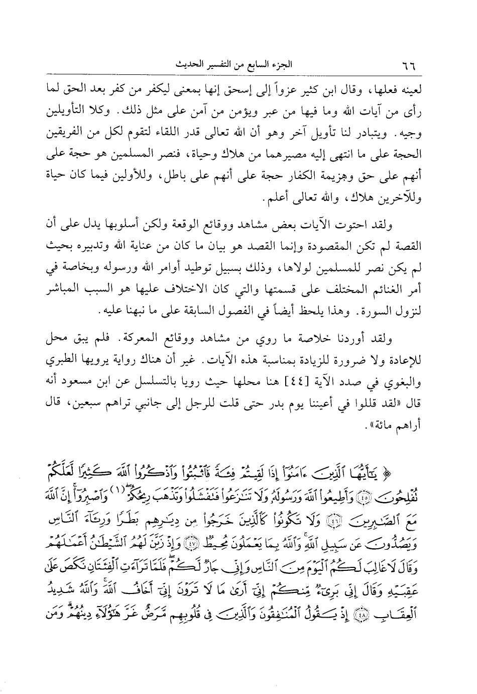 ولقد أوردنا خلاصة ما روي من مشاهد ووقائع المعركة. فلم يبق محل للإعادة ولا ضرورة للزيادة بمناسبة هذه الآيات. غير أن هناك رواية يرويها الطبري والبغوي في صدد الآية [44] هنا محلها حيث رويا بالتسلسل عن ابن مسعود أنه قال «لقد قللوا في أعيننا يوم بدر حتى قلت للرجل إلى جانبي تراهم سبعين، قال أراهم مائة» .