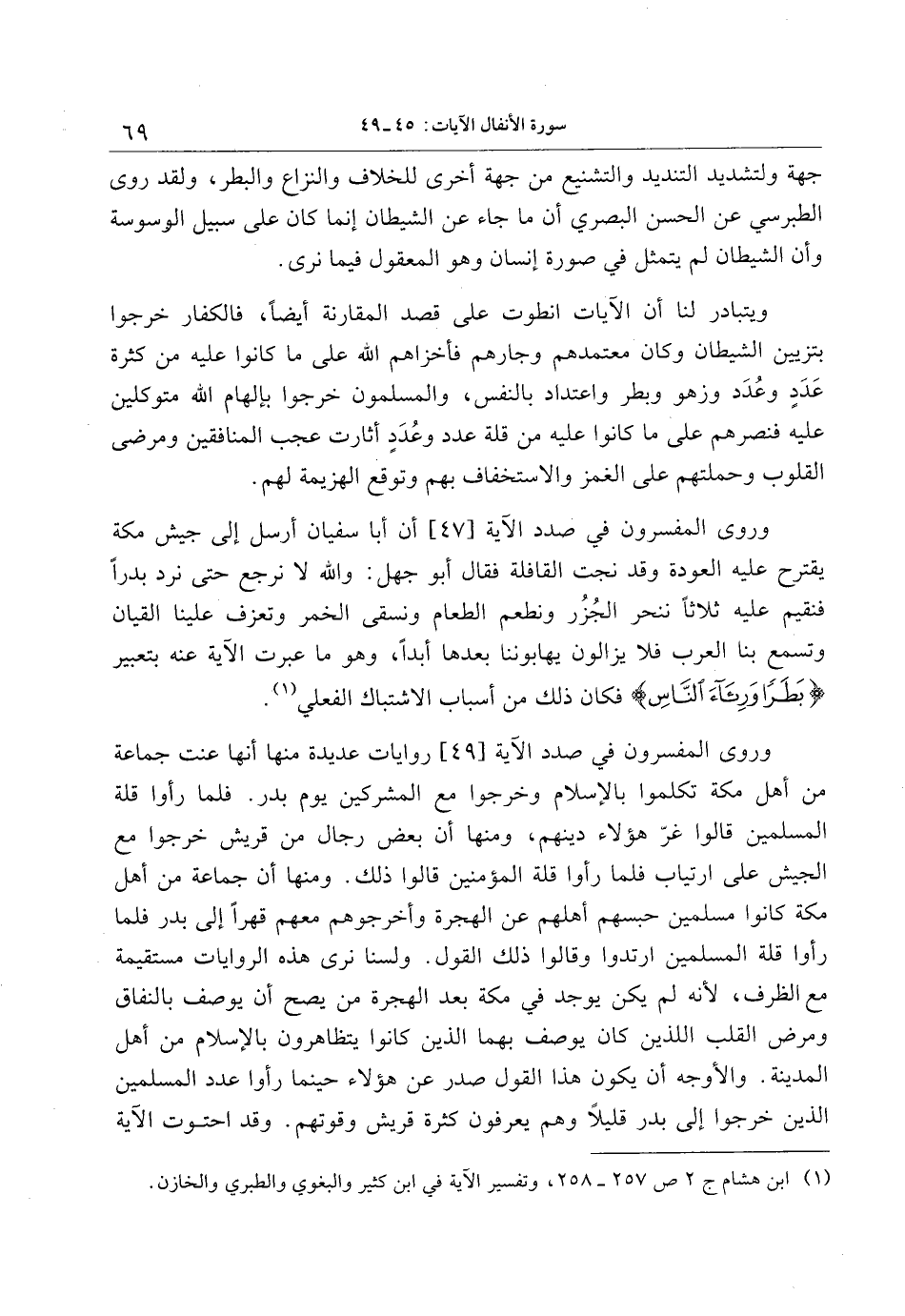 وروى المفسرون في صدد الآية [47] أن أبا سفيان أرسل إلى جيش مكة يقترح عليه العودة وقد نجت القافلة فقال أبو جهل: والله لا نرجع حتى نرد بدرا فنقيم عليه ثلاثا ننحر الجزر ونطعم الطعام ونسقى الخمر وتعزف علينا القيان وتسمع بنا العرب فلا يزالون يهابوننا بعدها أبدا، وهو ما عبرت الآية عنه بتعبير بَطَراً وَرِئاءَ النَّاسِ فكان ذلك من أسباب الاشتباك الفعلي «1» .