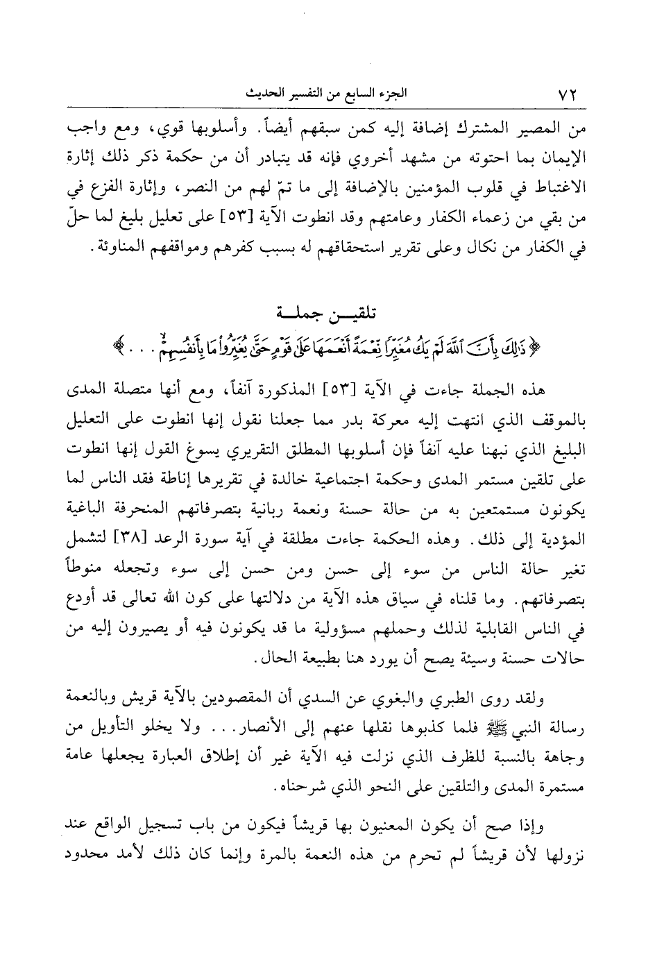 هذه الجملة جاءت في الآية [53] المذكورة آنفا، ومع أنها متصلة المدى بالموقف الذي انتهت إليه معركة بدر مما جعلنا نقول إنها انطوت على التعليل البليغ الذي نبهنا عليه آنفا فإن أسلوبها المطلق التقريري يسوغ القول إنها انطوت على تلقين مستمر المدى وحكمة اجتماعية خالدة في تقريرها إناطة فقد الناس لما يكونون مستمتعين به من حالة حسنة ونعمة ربانية بتصرفاتهم المنحرفة الباغية المؤدية إلى ذلك. وهذه الحكمة جاءت مطلقة في آية سورة الرعد [38] لتشمل تغير حالة الناس من سوء إلى حسن ومن حسن إلى سوء وتجعله منوطا بتصرفاتهم. وما قلناه في سياق هذه الآية من دلالتها على كون الله تعالى قد أودع في الناس القابلية لذلك وحملهم مسؤولية ما قد يكونون فيه أو يصيرون إليه من حالات حسنة وسيئة يصح أن يورد هنا بطبيعة الحال.