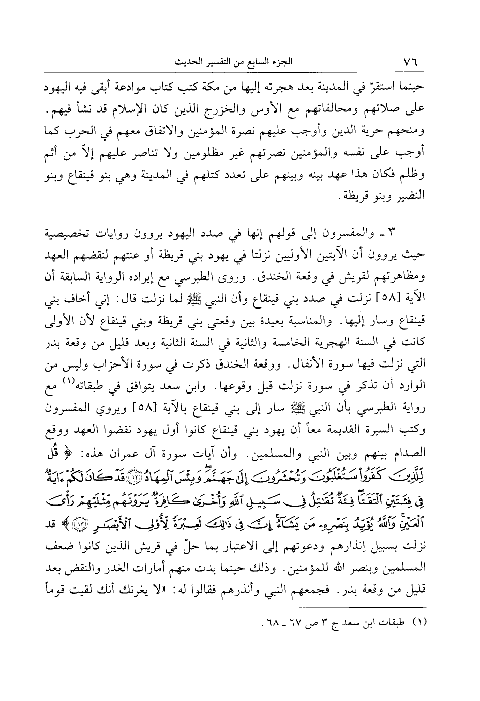 3- والمفسرون إلى قولهم إنها في صدد اليهود يروون روايات تخصيصية حيث يروون أن الآيتين الأوليين نزلتا في يهود بني قريظة أو عنتهم لنقضهم العهد ومظاهرتهم لقريش في وقعة الخندق. وروى الطبرسي مع إيراده الرواية السابقة أن الآية [58] نزلت في صدد بني قينقاع وأن النبي صلى الله عليه وسلم لما نزلت قال: إني أخاف بني قينقاع وسار إليها. والمناسبة بعيدة بين وقعتي بني قريظة وبني قينقاع لأن الأولى كانت في السنة الهجرية الخامسة والثانية في السنة الثانية وبعد قليل من وقعة بدر التي نزلت فيها سورة الأنفال. ووقعة الخندق ذكرت في سورة الأحزاب وليس من الوارد أن تذكر في سورة نزلت قبل وقوعها. وابن سعد يتوافق في طبقاته «1» مع رواية الطبرسي بأن النبي صلى الله عليه وسلم سار إلى بني قينقاع بالآية [58] ويروي المفسرون وكتب السيرة القديمة معا أن يهود بني قينقاع كانوا أول يهود نقضوا العهد ووقع الصدام بينهم وبين النبي والمسلمين. وأن آيات سورة آل عمران هذه: قُلْ لِلَّذِينَ كَفَرُوا سَتُغْلَبُونَ وَتُحْشَرُونَ إِلى جَهَنَّمَ وَبِئْسَ الْمِهادُ (12) قَدْ كانَ لَكُمْ آيَةٌ فِي فِئَتَيْنِ الْتَقَتا فِئَةٌ تُقاتِلُ فِي سَبِيلِ اللَّهِ وَأُخْرى كافِرَةٌ يَرَوْنَهُمْ مِثْلَيْهِمْ رَأْيَ الْعَيْنِ وَاللَّهُ يُؤَيِّدُ بِنَصْرِهِ مَنْ يَشاءُ إِنَّ فِي ذلِكَ لَعِبْرَةً لِأُولِي الْأَبْصارِ (13) قد نزلت بسبيل إنذارهم ودعوتهم إلى الاعتبار بما حلّ في قريش الذين كانوا ضعف المسلمين وبنصر الله للمؤمنين. وذلك حينما بدت منهم أمارات الغدر والنقض بعد قليل من وقعة بدر. فجمعهم النبي وأنذرهم فقالوا له: «لا يغرنك أنك لقيت قوما