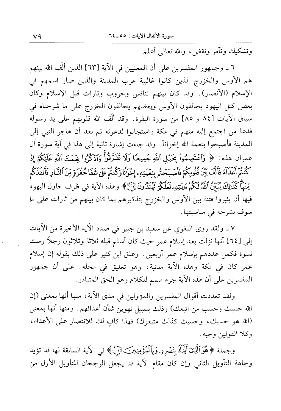 7- ولقد روى البغوي عن سعيد بن جبير في صدد الآية الأخيرة من الآيات إلى [64] أنها نزلت بعد إسلام عمر حيث كان أسلم قبله ثلاثة وثلاثون رجلا وست نسوة فكمل عددهم بإسلام عمر أربعين. وعلق ابن كثير على ذلك بقوله إن إسلام عمر كان في مكة وهذه الآية مدنية، وهو تعليق في محله. على أن جمهور المفسرين على أن هذه الآية جزء متمم للكلام وهو الحق المتبادر.