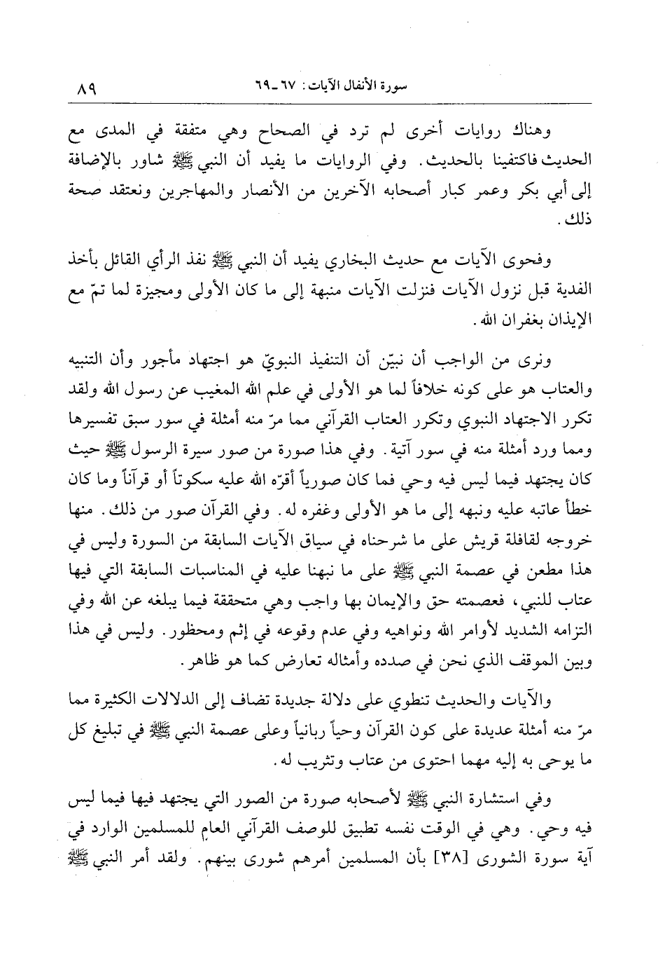 ونرى من الواجب أن نبيّن أن التنفيذ النبويّ هو اجتهاد مأجور وأن التنبيه والعتاب هو على كونه خلافا لما هو الأولى في علم الله المغيب عن رسول الله ولقد تكرر الاجتهاد النبوي وتكرر العتاب القرآني مما مرّ منه أمثلة في سور سبق تفسيرها ومما ورد أمثلة منه في سور آتية. وفي هذا صورة من صور سيرة الرسول صلى الله عليه وسلم حيث كان يجتهد فيما ليس فيه وحي فما كان صوريا أقرّه الله عليه سكوتا أو قرآنا وما كان خطأ عاتبه عليه ونبهه إلى ما هو الأولى وغفره له. وفي القرآن صور من ذلك. منها خروجه لقافلة قريش على ما شرحناه في سياق الآيات السابقة من السورة وليس في هذا مطعن في عصمة النبي صلى الله عليه وسلم على ما نبهنا عليه في المناسبات السابقة التي فيها عتاب للنبي، فعصمته حق والإيمان بها واجب وهي متحققة فيما يبلغه عن الله وفي التزامه الشديد لأوامر الله ونواهيه وفي عدم وقوعه في إثم ومحظور. وليس في هذا وبين الموقف الذي نحن في صدده وأمثاله تعارض كما هو ظاهر.