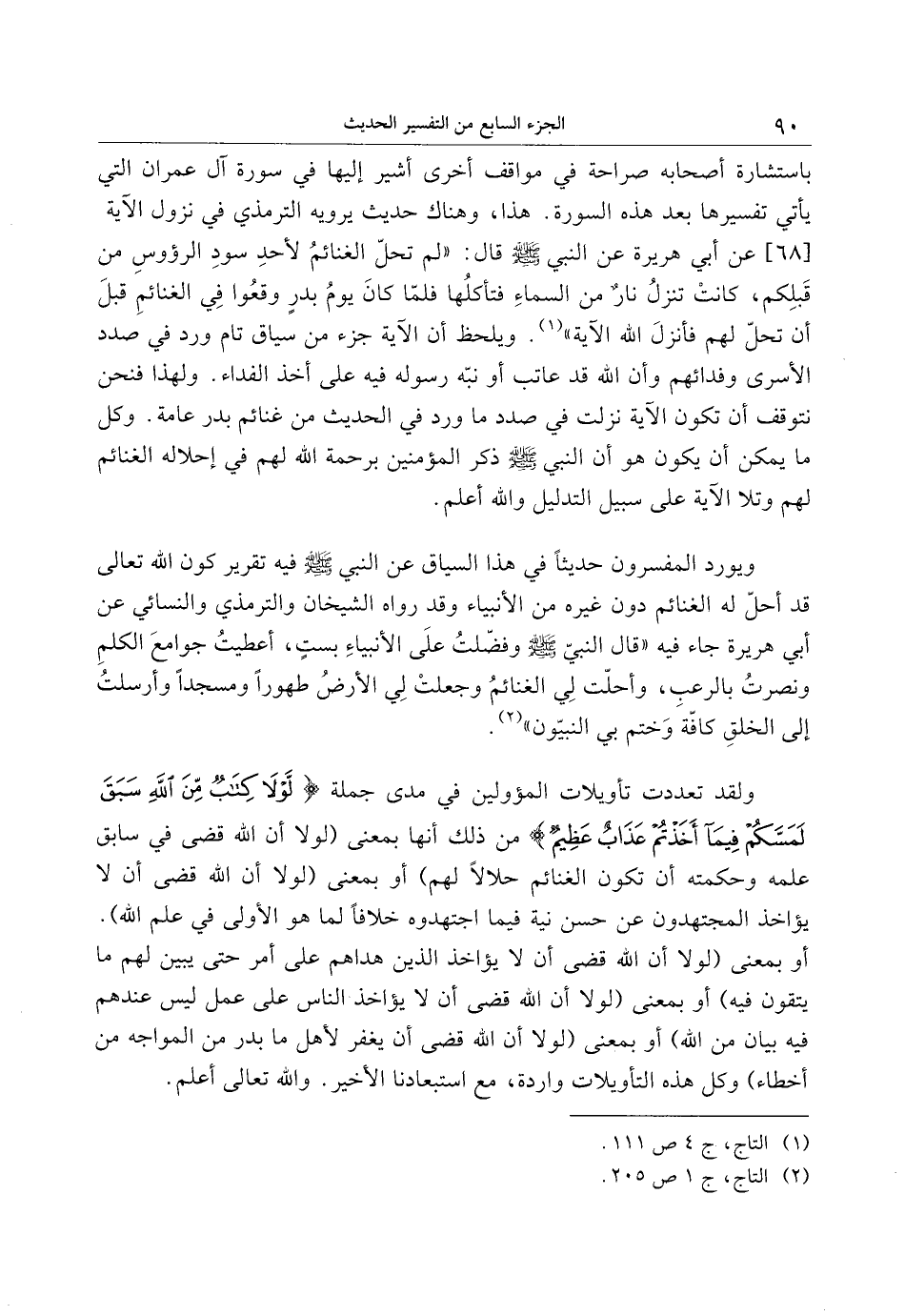 ويورد المفسرون حديثا في هذا السياق عن النبي صلى الله عليه وسلم فيه تقرير كون الله تعالى قد أحلّ له الغنائم دون غيره من الأنبياء وقد رواه الشيخان والترمذي والنسائي عن أبي هريرة جاء فيه «قال النبي صلى الله عليه وسلم وفضّلت على الأنبياء بست، أعطيت جوامع الكلم ونصرت بالرعب، وأحلّت لي الغنائم وجعلت لي الأرض طهورا ومسجدا وأرسلت إلى الخلق كافّة وختم بي النبيّون» «2» .