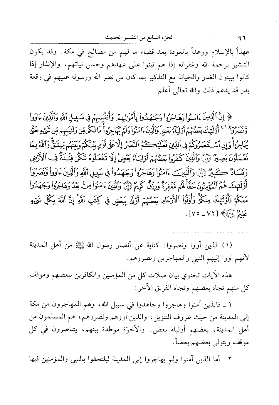 إِنَّ الَّذِينَ آمَنُوا وَهاجَرُوا وَجاهَدُوا بِأَمْوالِهِمْ وَأَنْفُسِهِمْ فِي سَبِيلِ اللَّهِ وَالَّذِينَ آوَوْا وَنَصَرُوا أُولئِكَ بَعْضُهُمْ أَوْلِياءُ بَعْضٍ وَالَّذِينَ آمَنُوا وَلَمْ يُهاجِرُوا ما لَكُمْ مِنْ وَلايَتِهِمْ مِنْ شَيْءٍ حَتَّى يُهاجِرُوا وَإِنِ اسْتَنْصَرُوكُمْ فِي الدِّينِ فَعَلَيْكُمُ النَّصْرُ إِلاَّ عَلى قَوْمٍ بَيْنَكُمْ وَبَيْنَهُمْ مِيثاقٌ وَاللَّهُ بِما تَعْمَلُونَ بَصِيرٌ (72) وَالَّذِينَ كَفَرُوا بَعْضُهُمْ أَوْلِياءُ بَعْضٍ إِلاَّ تَفْعَلُوهُ تَكُنْ فِتْنَةٌ فِي الْأَرْضِ وَفَسادٌ كَبِيرٌ (73) وَالَّذِينَ آمَنُوا وَهاجَرُوا وَجاهَدُوا فِي سَبِيلِ اللَّهِ وَالَّذِينَ آوَوْا وَنَصَرُوا أُولئِكَ هُمُ الْمُؤْمِنُونَ حَقًّا لَهُمْ مَغْفِرَةٌ وَرِزْقٌ كَرِيمٌ (74) وَالَّذِينَ آمَنُوا مِنْ بَعْدُ وَهاجَرُوا وَجاهَدُوا مَعَكُمْ فَأُولئِكَ مِنْكُمْ وَأُولُوا الْأَرْحامِ بَعْضُهُمْ أَوْلى بِبَعْضٍ فِي كِتابِ اللَّهِ إِنَّ اللَّهَ بِكُلِّ شَيْءٍ عَلِيمٌ (75)