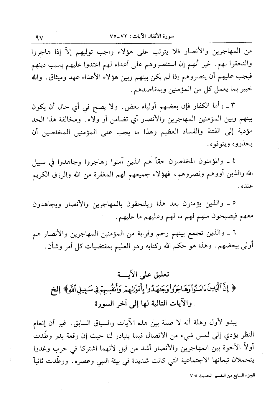 تعليق على الآية إِنَّ الَّذِينَ آمَنُوا وَهاجَرُوا وَجاهَدُوا بِأَمْوالِهِمْ وَأَنْفُسِهِمْ فِي سَبِيلِ اللَّهِ إلخ والآيات التالية لها إلى آخر السورة