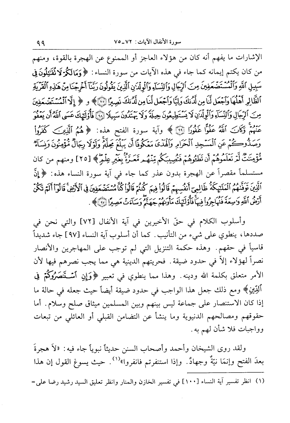 وأسلوب الكلام في حقّ الأخيرين في آية الأنفال [72] والتي نحن في صددها، ينطوي على شيء من التأنيب. كما أن أسلوب آية النساء [97] جاء شديدا قاسيا في حقهم. وهذه حكمة التنزيل التي لم توجب على المهاجرين والأنصار نصرا لهؤلاء إلّا في حدود ضيقة. فحريتهم الدينية هي مما يجب نصرهم فيها لأن الأمر متعلق بكلمة الله ودينه وهذا مما ينطوي في تعبير وَإِنِ اسْتَنْصَرُوكُمْ فِي الدِّينِ ومع ذلك جعل هذا الواجب في حدود ضيقة أيضا حيث جعله في حالة ما إذا كان الاستنصار على جماعة ليس بينهم وبين المسلمين ميثاق صلح وسلام. أما حقوقهم ومصالحهم الدنيوية وما ينشأ عن التضامن القبلي أو العائلي من تبعات وواجبات فلا شأن لهم به.