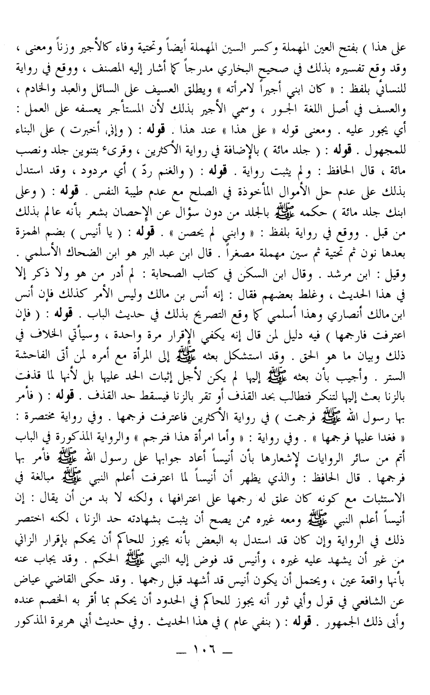ـــــــــــــــــــــــــــــQعَلَى هَذَا) بِفَتْحِ الْعَيْنِ الْمُهْمَلَةِ وَكَسْرِ السِّين الْمُهْمَلَةِ أَيْضًا وَتَحْتِيَّةٌ وَفَاءٌ كَالْأَجِيرِ وَزْنًا وَمَعْنًى، وَقَدْ وَقَعَ تَفْسِيرُهُ بِذَلِكَ فِي صَحِيحِ الْبُخَارِيِّ مُدْرَجًا كَمَا أَشَارَ إلَيْهِ الْمُصَنِّفُ، وَوَقَعَ فِي رِوَايَةٍ لِلنَّسَائِيِّ بِلَفْظِ: " كَانَ ابْنِي أَجِيرًا لِامْرَأَتِهِ " وَيُطْلَقُ الْعَسِيفُ عَلَى السَّائِلِ وَالْعَبْدِ وَالْخَادِمِ، وَالْعَسْفُ فِي أَصْلِ اللُّغَةِ الْجَوْرُ، وَسُمِّيَ الْأَجِيرُ بِذَلِكَ لِأَنَّ الْمُسْتَأْجِرَ يَعْسِفُهُ عَلَى الْعَهَلِ: أَيْ يَجُورُ عَلَيْهِ وَمَعْنَى قَوْلِهِ " عَلَى هَذَا " عِنْدَ هَذَا. قَوْلُهُ: (وَإِنِّي أُخْبِرْتُ) عَلَى الْبِنَاءِ لِلْمَجْهُولِ. قَوْلُهُ: (جَلْدُ مِائَةٍ) بِالْإِضَافَةِ فِي رِوَايَةِ الْأَكْثَرِينَ، وَقُرِئَ بِتَنْوِينِ جَلْدٍ وَنَصْبِ مِائَةٍ، قَالَ الْحَافِظُ: وَلَمْ يَثْبُتْ رِوَايَةً، قَوْلُهُ: (وَالْغَنَمُ رَدٌّ) أَيْ مَرْدُودٌ، وَقَدْ اُسْتُدِلَّ بِذَلِكَ عَلَى عَدَم حِلِّ الْأَمْوَالِ الْمَأْخُوذَةِ فِي الصُّلْحِ مَعَ عَدَمِ طِيبَةِ النَّفْسِ
