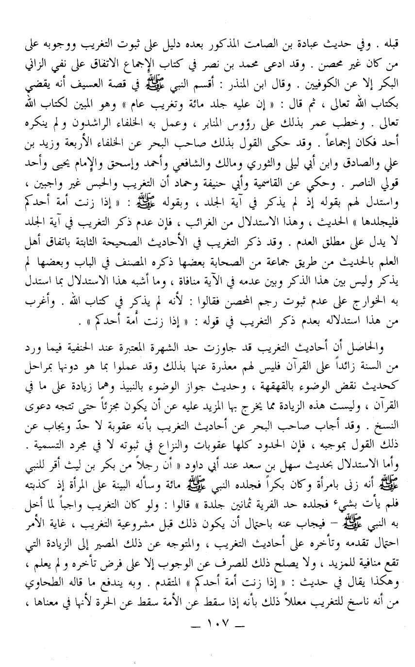 وَأَغْرَبُ مِنْ هَذَا اسْتِدْلَالُهُ بِعَدَمِ ذِكْرِ التَّغْرِيبِ فِي قَوْلِهِ: «إذَا زَنَتْ أَمَةُ أَحَدِكُمْ» . وَالْحَاصِلُ أَنَّ أَحَادِيثَ التَّغْرِيبِ قَدْ جَاوَزَتْ حَدَّ الشُّهْرَةِ الْمُعْتَبَرَةِ عِنْدَ الْحَنَفِيَّةِ فِيمَا وَرَدَ مِنْ السُّنَّةِ زَائِدًا عَلَى الْقُرْآنِ فَلَيْسَ لَهُمْ مَعْذِرَةٌ عَنْهَا بِذَلِكَ وَقَدْ عَمِلُوا بِمَا هُوَ دُونَهَا بِمَرَاحِلَ كَحَدِيثِ نَقْضِ الْوُضُوءِ بِالْقَهْقَهَةِ، وَحَدِيثِ جَوَازِ الْوُضُوءِ بِالنَّبِيذِ وَهُمَا زِيَادَةٌ عَلَى مَا فِي الْقُرْآنِ، وَلَيْسَتْ هَذِهِ الزِّيَادَةُ مِمَّا يَخْرُجُ بِهَا الْمَزِيدُ عَلَيْهِ عَنْ أَنْ يَكُونَ مُجْزِئًا حَتَّى تَتَّجِهَ دَعْوَى النَّسْخِ