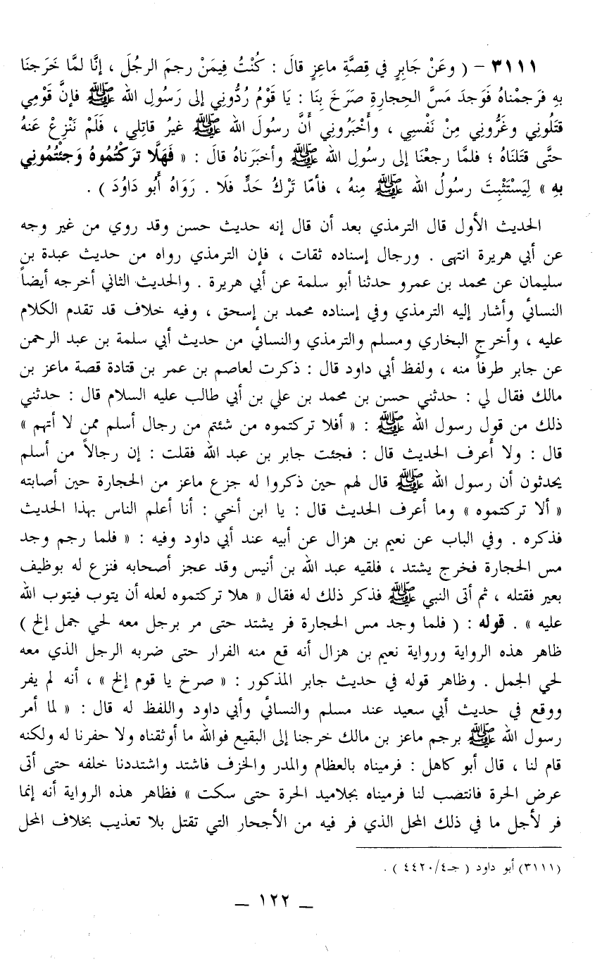 3111 - (وَعَنْ جَابِرٍ فِي قِصَّةِ مَاعِزٍ قَالَ: «كُنْت فِيمَنْ رَجَمَ الرَّجُلَ، إنَّا لَمَّا خَرَجْنَا بِهِ فَرَجَمْنَاهُ فَوَجَدَ مَسَّ الْحِجَارَةِ صَرَخَ بِنَا: يَا قَوْمُ رُدُّونِي إلَى رَسُولِ اللَّهِ - صَلَّى اللَّهُ عَلَيْهِ وَسَلَّمَ - فَإِنَّ قَوْمِي قَتَلُونِي وَغَرُّونِي مِنْ نَفْسِي، وَأَخْبَرُونِي أَنَّ رَسُولَ اللَّهِ - صَلَّى اللَّهُ عَلَيْهِ وَسَلَّمَ - غَيْرُ قَاتِلِي، فَلَمْ نَنْزِعْ عَنْهُ حَتَّى قَتَلْنَاهُ فَلَمَّا رَجَعْنَا إلَى رَسُولِ اللَّهِ - صَلَّى اللَّهُ عَلَيْهِ وَسَلَّمَ - وَأَخْبَرْنَاهُ قَالَ: فَهَلَّا تَرَكْتُمُوهُ وَجِئْتُمُونِي بِهِ لِيَسْتَثْبِتَ رَسُولُ اللَّهِ - صَلَّى اللَّهُ عَلَيْهِ وَسَلَّمَ - مِنْهُ، فَأَمَّا تَرْكُ حَدٍّ فَلَا» . رَوَاهُ أَبُو دَاوُد) .