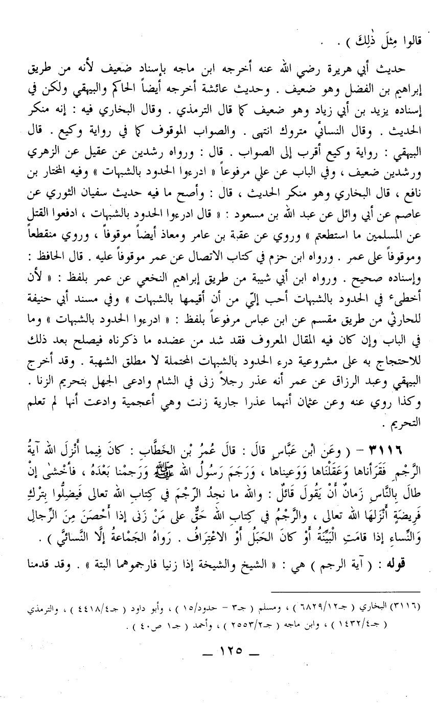 3116 - (وَعَنْ ابْنِ عَبَّاسٍ قَالَ: قَالَ عُمَرُ بْنُ الْخَطَّابِ: «كَانَ فِيمَا أَنْزَلَ اللَّهُ آيَةُ الرَّجْمِ فَقَرَأْنَاهَا وَعَقَلْنَاهَا وَوَعَيْنَاهَا، وَرَجَمَ رَسُولُ اللَّهِ - صَلَّى اللَّهُ عَلَيْهِ وَسَلَّمَ - وَرَجَمْنَا بَعْدَهُ، فَأَخْشَى إنْ طَالَ بِالنَّاسِ زَمَانٌ أَنْ يَقُولَ قَائِلٌ: وَاَللَّهِ مَا نَجِدُ الرَّجْمَ فِي كِتَابِ اللَّهِ تَعَالَى فَيَضِلُّوا بِتَرْكِ فَرِيضَةٍ أَنْزَلَهَا اللَّهُ تَعَالَى، وَالرَّجْمُ فِي كِتَابِ اللَّهِ حَقٌّ عَلَى مَنْ زَنَى إذَا أُحْصِنَ مِنْ الرِّجَالِ وَالنِّسَاءِ إذَا قَامَتْ الْبَيِّنَةُ أَوْ كَانَ الْحَبَلُ أَوْ الِاعْتِرَافُ.» رَوَاهُ الْجَمَاعَةُ إلَّا النَّسَائِيّ)