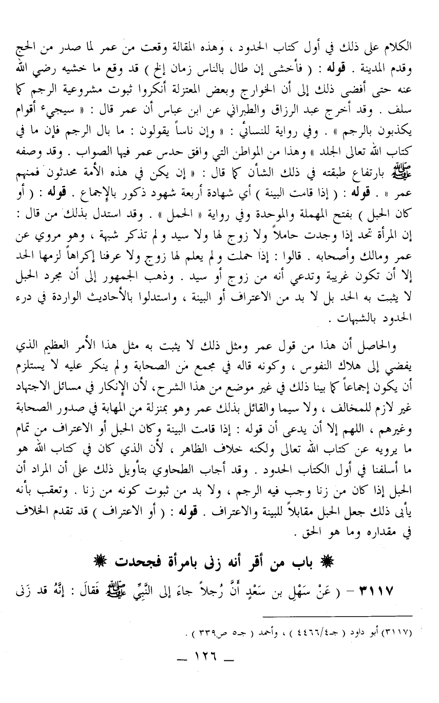 وَالْحَاصِلُ أَنَّ هَذَا مِنْ قَوْلِ عُمَرَ وَمِثْلُ ذَلِكَ لَا يَثْبُتُ بِهِ مِثْلُ هَذَا الْأَمْرِ الْعَظِيمِ الَّذِي يُفْضِي إلَى هَلَاكِ النُّفُوسِ، وَكَوْنُهُ قَالَهُ فِي مَجْمَعٍ مِنْ الصَّحَابَةِ وَلَمْ يُنْكَرْ عَلَيْهِ لَا يَسْتَلْزِمُ أَنْ يَكُونَ إجْمَاعًا كَمَا بَيَّنَّا ذَلِكَ فِي غَيْرِ مَوْضِعٍ مِنْ هَذَا الشَّرْحِ؛ لِأَنَّ الْإِنْكَارَ فِي مَسَائِلِ الِاجْتِهَادِ غَيْرُ لَازِمٍ لِلْمُخَالِفِ، وَلَا سِيَّمَا وَالْقَائِلُ بِذَلِكَ عُمَرُ وَهُوَ بِمَنْزِلَةٍ مِنْ الْمَهَابَةِ فِي صُدُورِ الصَّحَابَةِ وَغَيْرِهِمْ، اللَّهُمَّ إلَّا أَنْ يُدَّعَى أَنَّ قَوْلَهُ: إذَا قَامَتْ الْبَيِّنَةُ وَكَانَ الْحَبَلُ أَوْ الِاعْتِرَافُ مِنْ تَمَامِ مَا يَرْوِيهِ عَنْ كِتَابِ اللَّهِ تَعَالَى وَلَكِنَّهُ خِلَافُ الظَّاهِرِ؛ لِأَنَّ الَّذِي كَانَ فِي كِتَابِ اللَّهِ هُوَ مَا أَسَلَفْنَا فِي أَوَّلِ كِتَابِ الْحُدُودِ. وَقَدْ أَجَابَ الطَّحَاوِيُّ بِتَأْوِيلِ ذَلِكَ عَلَى أَنَّ الْمُرَادَ أَنَّ الْحَبَلَ إذَا كَانَ مِنْ زِنًا وَجَبَ فِيهِ الرَّجْمُ، وَلَا بُدَّ مِنْ ثُبُوتِ كَوْنِهِ مِنْ زِنًا. وَتُعُقِّبَ بِأَنَّهُ يَأْبَى ذَلِكَ جَعْلُ الْحَبَلِ مُقَابِلًا لِلْبَيِّنَةِ وَالِاعْتِرَافِ. قَوْلُهُ: (أَوْ الِاعْتِرَافُ) قَدْ تَقَدَّمَ الْخِلَافُ فِي مِقْدَارِهِ وَمَا هُوَ الْحَقُّ.