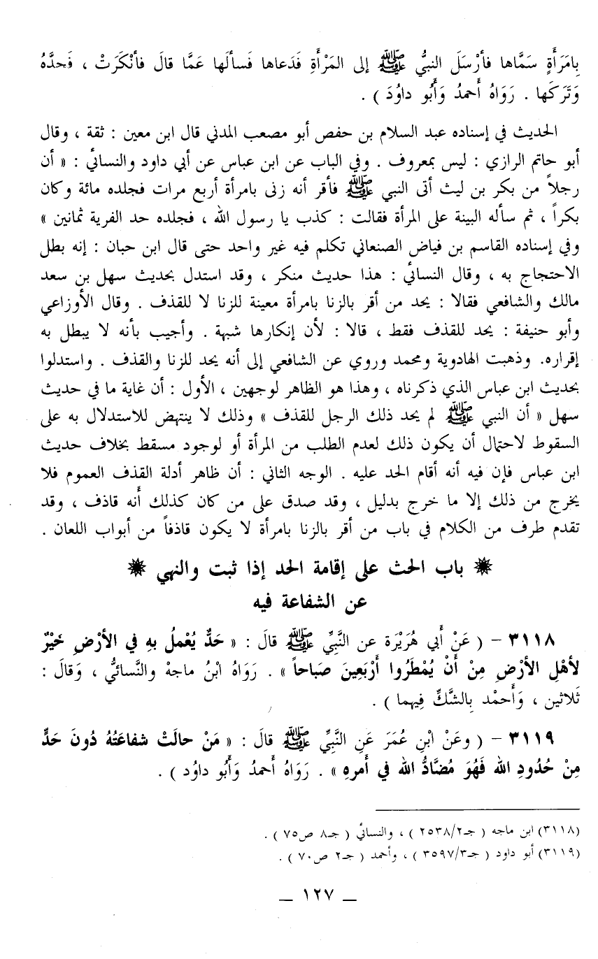 وَفِي الْبَابِ عَنْ ابْنِ عَبَّاسٍ عَنْ أَبِي دَاوُد وَالنَّسَائِيُّ: «أَنَّ رَجُلًا مِنْ بَكْرِ بْنِ لَيْثٍ أَتَى النَّبِيَّ - صَلَّى اللَّهُ عَلَيْهِ وَسَلَّمَ - فَأَقَرَّ أَنَّهُ زَنَى بِامْرَأَةٍ أَرْبَعَ مَرَّاتٍ فَجَلَدَهُ مِائَةً وَكَانَ بِكْرًا، ثُمَّ سَأَلَهُ الْبَيِّنَةَ عَلَى الْمَرْأَةِ فَقَالَتْ: كَذَبَ يَا رَسُولَ اللَّهِ، فَجَلَدَهُ حَدَّ الْفِرْيَةِ ثَمَانِينَ» وَفِي إسْنَادِهِ الْقَاسِمُ بْنُ فَيَّاضٍ الصَّنْعَانِيُّ تَكَلَّمَ فِيهِ غَيْرُ وَاحِدٍ حَتَّى قَالَ ابْنُ حِبَّانَ: إنَّهُ بَطَلَ الِاحْتِجَاجُ بِهِ، وَقَالَ النَّسَائِيّ: هَذَا حَدِيثٌ مُنْكَرٌ، وَقَدْ اسْتَدَلَّ بِحَدِيثِ سَهْلِ بْنِ سَعْدٍ مَالِكٌ وَالشَّافِعِيُّ فَقَالَا: يُحَدُّ مَنْ أَقَرَّ بِالزِّنَا بِامْرَأَةٍ مُعَيَّنَةً لِلزِّنَا لَا لِلْقَذْفِ.