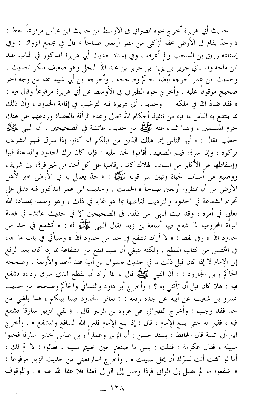 وَحَدِيثُ ابْنِ عُمَرَ أَخْرَجَهُ أَيْضًا الْحَاكِمُ وَصَحَّحَهُ، وَأَخْرَجَهُ ابْنُ أَبِي شَيْبَةَ عَنْهُ مِنْ وَجْهٍ آخَرَ صَحِيحٍ مَوْقُوفًا عَلَيْهِ. وَأَخْرَجَ نَحْوَهُ الطَّبَرَانِيُّ فِي الْأَوْسَطِ عَنْ أَبِي هُرَيْرَةَ مَرْفُوعًا وَقَالَ فِيهِ: «فَقَدْ ضَادَّ اللَّهَ فِي مُلْكِهِ» . وَحَدِيثُ أَبِي هُرَيْرَةَ فِيهِ التَّرْغِيبُ فِي إقَامَةِ الْحُدُودِ، وَأَنَّ ذَلِكَ مِمَّا يَنْتَفِعُ بِهِ النَّاسُ لِمَا فِيهِ مِنْ تَنْفِيذِ أَحْكَامِ اللَّهِ تَعَالَى وَعَدَمِ الرَّأْفَةِ بِالْعُصَاةِ وَرَدْعِهِمْ عَنْ هَتْكِ حُرُمِ الْمُسْلِمِينَ،