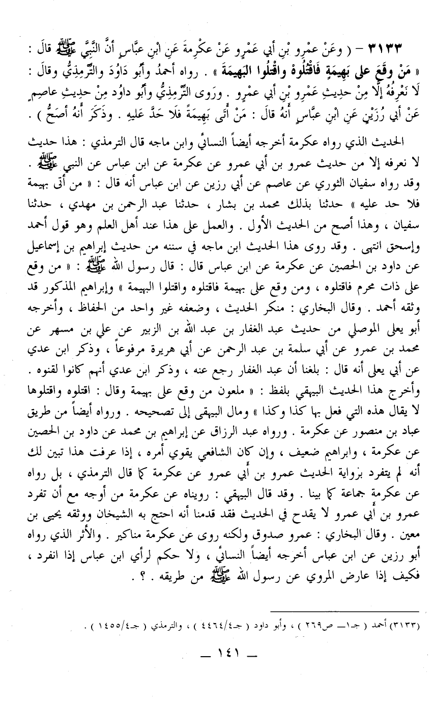 3133 - (وَعَنْ عَمْرِو بْنِ أَبِي عَمْرٍو عَنْ عِكْرِمَةَ عَنْ ابْنِ عَبَّاسٍ أَنَّ النَّبِيَّ - صَلَّى اللَّهُ عَلَيْهِ وَسَلَّمَ - قَالَ: «مَنْ وَقَعَ عَلَى بَهِيمَةٍ فَاقْتُلُوهُ وَاقْتُلُوا الْبَهِيمَةَ» . رَوَاهُ أَحْمَدُ وَأَبُو دَاوُد وَالتِّرْمِذِيُّ وَقَالَ: لَا نَعْرِفُهُ إلَّا مِنْ حَدِيثِ عَمْرِو بْنِ أَبِي عَمْرٍو. وَرَوَى التِّرْمِذِيُّ وَأَبُو دَاوُد مِنْ حَدِيثِ عَاصِمٍ عَنْ أَبِي رَزِينٍ عَنْ ابْنِ عَبَّاسٍ أَنَّهُ قَالَ: مَنْ أَتَى بَهِيمَةً فَلَا حَدَّ عَلَيْهِ. وَذَكَرَ أَنَّهُ أَصَحُّ) .