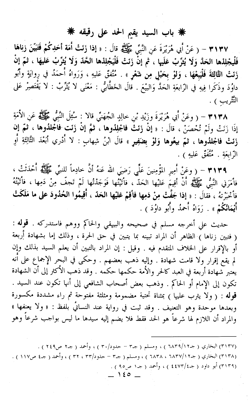 عَنْ أَبِي هُرَيْرَةَ عَنْ النَّبِيِّ - صَلَّى اللَّهُ عَلَيْهِ وَسَلَّمَ - قَالَ: «إذَا زَنَتْ أَمَةُ أَحَدِكُمْ فَتَبَيَّنَ زِنَاهَا فَلْيَجْلِدْهَا الْحَدَّ وَلَا يُثَرِّبْ عَلَيْهَا، ثُمَّ إنْ زَنَتْ فَلْيَجْلِدْهَا الْحَدَّ وَلَا يُثَرِّبْ عَلَيْهَا، ثُمَّ إنْ زَنَتْ الثَّالِثَةَ فَلْيَبِعْهَا، وَلَوْ بِحَبْلٍ مِنْ شَعَرٍ» . مُتَّفَقٌ عَلَيْهِ، وَرَوَاهُ أَحْمَدُ فِي رِوَايَةٍ وَأَبُو دَاوُد وَذَكَرَا فِيهِ فِي الرَّابِعَةِ الْحَدَّ وَالْبَيْعَ. قَالَ الْخَطَّابِيِّ: مَعْنَى لَا يُثَرِّبْ: لَا يَقْتَصِرْ عَلَى التَّثْرِيبِ) .