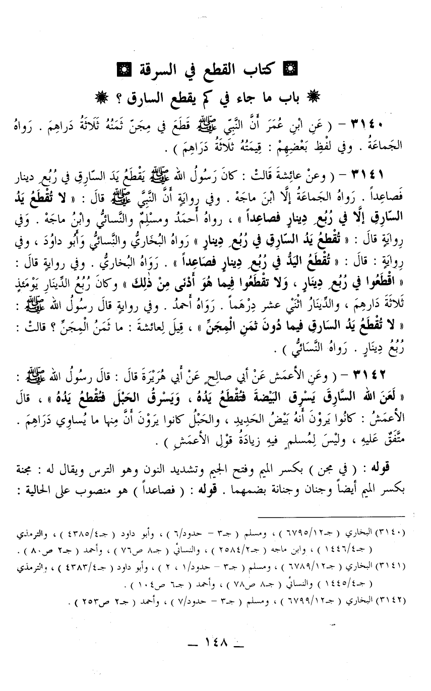 3141 - (وَعَنْ عَائِشَةَ قَالَتْ: «كَانَ رَسُولُ اللَّهِ - صَلَّى اللَّهُ عَلَيْهِ وَسَلَّمَ - يَقْطَعُ يَدَ السَّارِقِ فِي رُبُعِ دِينَارٍ فَصَاعِدًا» . رَوَاهُ الْجَمَاعَةُ إلَّا ابْنَ مَاجَهْ.