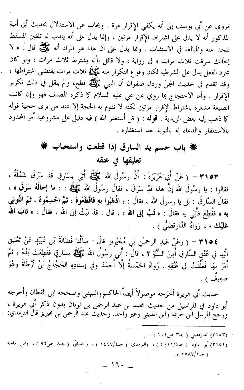 3153 - (عَنْ أَبِي هُرَيْرَةَ: «أَنَّ رَسُولَ اللَّهِ - صَلَّى اللَّهُ عَلَيْهِ وَسَلَّمَ - أُتِيَ بِسَارِقٍ قَدْ سَرَقَ شَمْلَةً، فَقَالُوا: يَا رَسُولَ اللَّهِ إنَّ هَذَا قَدْ سَرَقَ، فَقَالَ رَسُولُ اللَّهِ - صَلَّى اللَّهُ عَلَيْهِ وَسَلَّمَ -: مَا إخَالَهُ سَرَقَ، فَقَالَ السَّارِقُ: بَلَى يَا رَسُولَ اللَّهِ، فَقَالَ: اذْهَبُوا بِهِ فَاقْطَعُوهُ، ثُمَّ احْسِمُوهُ، ثُمَّ ائْتُونِي بِهِ فَقُطِعَ فَأُتِيَ بِهِ فَقَالَ: تُبْ إلَى اللَّهِ، قَالَ: قَدْ تُبْتُ إلَى اللَّهِ، فَقَالَ: تَابَ اللَّهُ عَلَيْك» ، رَوَاهُ الدَّارَقُطْنِيّ) .