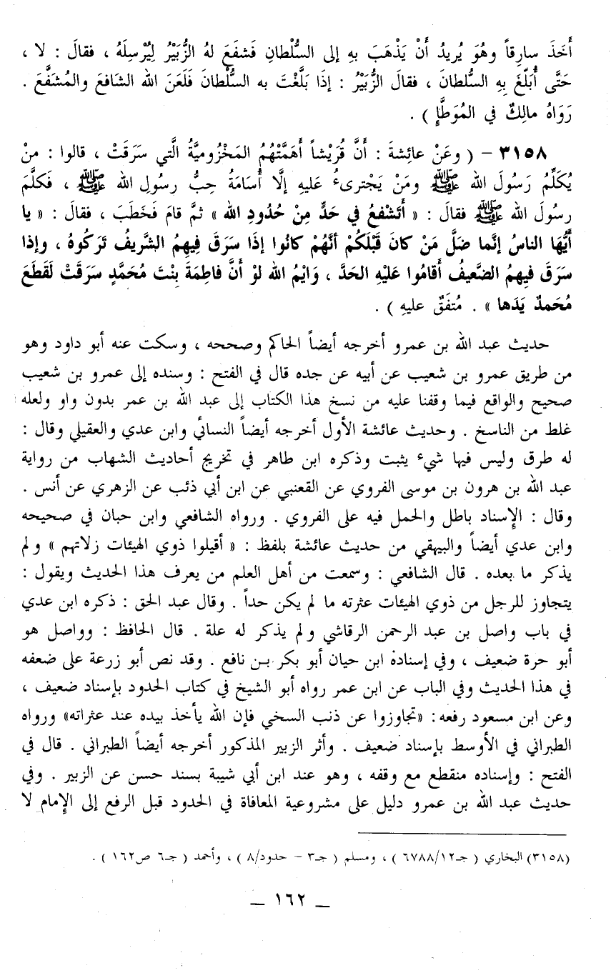 3158 - (وَعَنْ عَائِشَةَ: «أَنَّ قُرَيْشًا أَهَمَّتْهُمْ الْمَخْزُومِيَّةُ الَّتِي سَرَقَتْ، قَالُوا: مَنْ يُكَلِّمُ رَسُولَ اللَّهِ - صَلَّى اللَّهُ عَلَيْهِ وَسَلَّمَ - وَمَنْ يَجْتَرِئُ عَلَيْهِ إلَّا أُسَامَةُ حِبُّ رَسُولِ اللَّهِ - صَلَّى اللَّهُ عَلَيْهِ وَسَلَّمَ -، فَكَلَّمَ رَسُولَ اللَّهِ - صَلَّى اللَّهُ عَلَيْهِ وَسَلَّمَ - فَقَالَ: أَتَشْفَعُ فِي حَدٍّ مِنْ حُدُودِ اللَّهِ ثُمَّ قَامَ فَخَطَبَ، فَقَالَ: يَا أَيُّهَا النَّاسُ إنَّمَا ضَلَّ مَنْ كَانَ قَبْلَكُمْ أَنَّهُمْ كَانُوا إذَا سَرَقَ فِيهِمْ الشَّرِيفُ تَرَكُوهُ، وَإِذَا سَرَقَ فِيهِمْ الضَّعِيفُ أَقَامُوا عَلَيْهِ الْحَدَّ، وَاَيْمُ اللَّهِ لَوْ أَنَّ فَاطِمَةَ بِنْتَ مُحَمَّدٍ سَرَقَتْ لَقَطَعَ مُحَمَّدٌ يَدَهَا» . مُتَّفَقٌ عَلَيْهِ) .