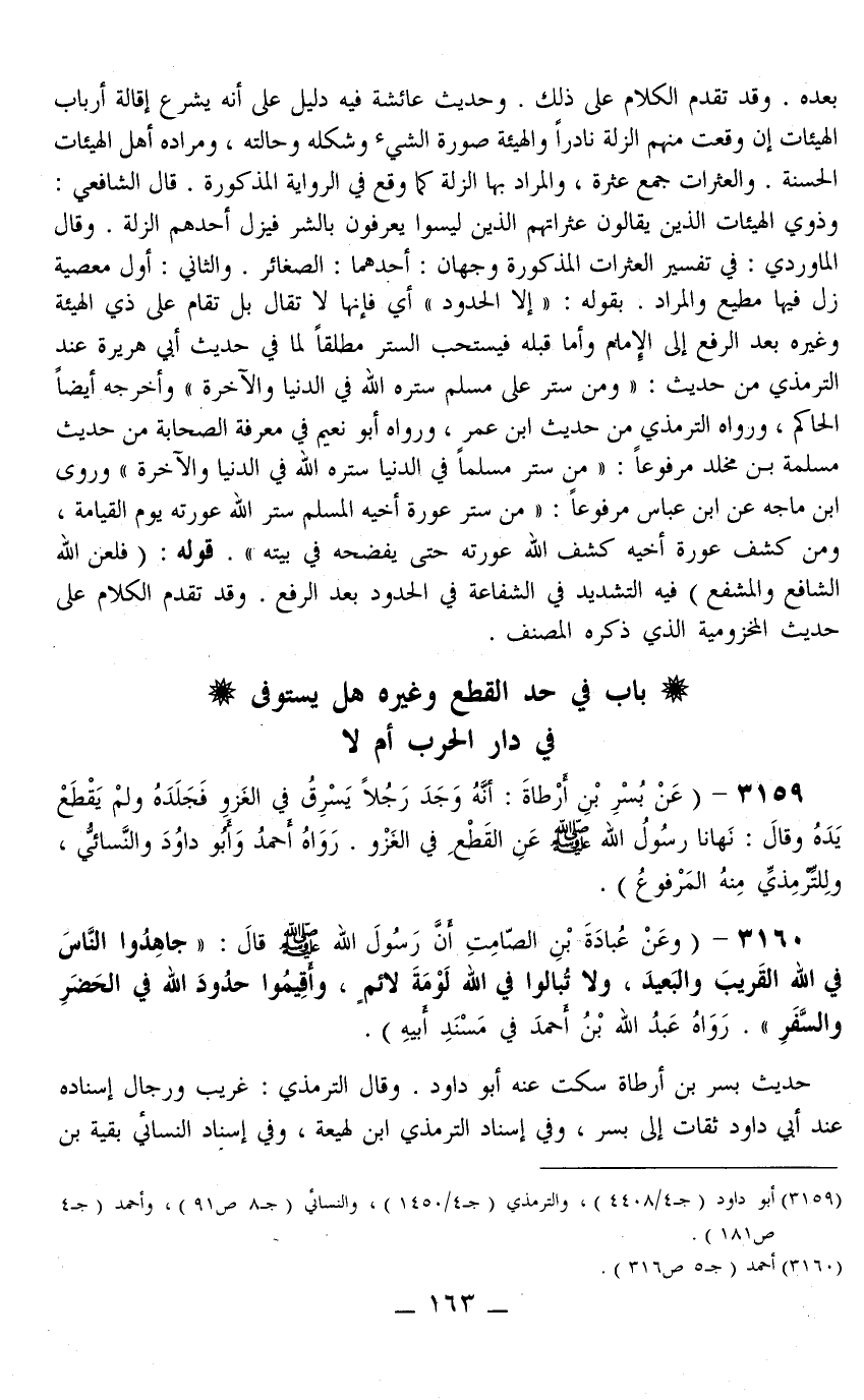 3159 - (عَنْ بُسْرِ بْنِ أَرْطَاةَ: «أَنَّهُ وَجَدَ رَجُلًا يَسْرِقُ فِي الْغَزْوِ فَجَلَدَهُ وَلَمْ يَقْطَعْ يَدَهُ وَقَالَ: نَهَانَا رَسُولُ اللَّهِ - صَلَّى اللَّهُ عَلَيْهِ وَسَلَّمَ - عَنْ الْقَطْعِ فِي الْغَزْوِ» . رَوَاهُ أَحْمَدُ وَأَبُو دَاوُد وَالنَّسَائِيُّ، وَلِلتِّرْمِذِيِّ مِنْهُ الْمَرْفُوعُ) .