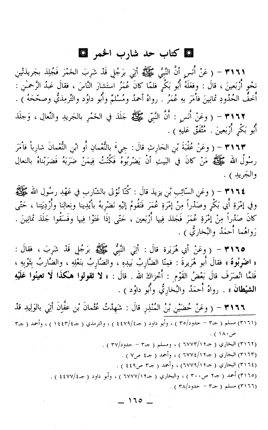 عَنْ أَنَسٍ «أَنَّ النَّبِيَّ - صَلَّى اللَّهُ عَلَيْهِ وَسَلَّمَ - أُتِيَ بِرَجُلٍ قَدْ شَرِبَ الْخَمْرَ فَجُلِدَ بِجَرِيدَتَيْنِ نَحْوَ أَرْبَعِينَ» ، قَالَ: وَفَعَلَهُ أَبُو بَكْرٍ فَلَمَّا كَانَ عُمَرُ اسْتَشَارَ النَّاسَ، فَقَالَ عَبْدُ الرَّحْمَنِ: أَخَفُّ الْحُدُودِ ثَمَانِينَ فَأَمَرَ بِهِ عُمَرُ. رَوَاهُ أَحْمَدُ وَمُسْلِمٌ وَأَبُو دَاوُد وَالتِّرْمِذِيُّ وَصَحَّحَهُ) .