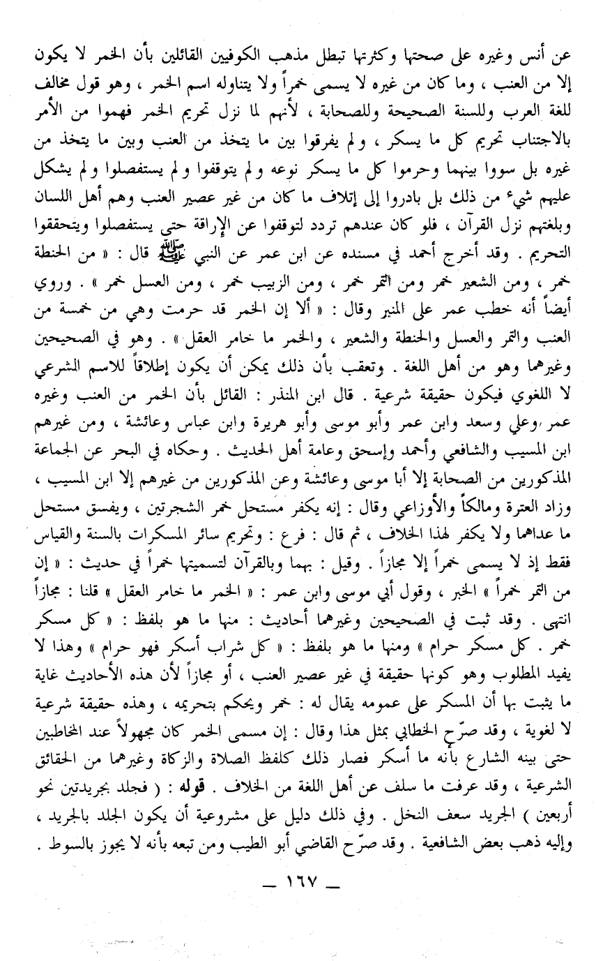 ـــــــــــــــــــــــــــــQعَنْ أَنَسٍ وَغَيْرِهِ عَلَى صِحَّتهَا وَكَثْرَتِهَا تُبْطِلُ مَذْهَبَ الْكُوفِيِّينَ الْقَائِلِينَ بِأَنَّ الْخَمْرَ لَا يَكُونُ إلَّا مِنْ الْعِنَبِ، وَمَا كَانَ مِنْ غَيْرِهِ لَا يُسَمَّى خَمْرًا وَلَا يَتَنَاوَلُهُ اسْمُ الْخَمْرِ، وَهُوَ قَوْلٌ مُخَالِفٌ لِلُغَةِ الْعَرَبِ وَلِلسُّنَّةِ الصَّحِيحَةِ وَلِلصَّحَابَةِ؛ لِأَنَّهُمْ لَمَّا نَزَلَ تَحْرِيمُ الْخَمْرِ فَهِمُوا مِنْ الْأَمْرِ بِالِاجْتِنَابِ تَحْرِيمَ كُلِّ مَا يُسْكِرُ، وَلَمْ يُفَرِّقُوا بَيْنَ مَا يُتَّخَذُ مِنْ الْعِنَبِ وَبَيْنَ مَا يُتَّخَذُ مِنْ غَيْرِهِ بَلْ سَوَّوْا بَيْنَهُمَا وَحَرَّمُوا كُلَّ مَا يُسْكِرُ نَوْعُهُ وَلَمْ يَتَوَقَّفُوا وَلَمْ يَسْتَفْصِلُوا وَلَمْ يُشْكِلْ عَلَيْهِمْ شَيْءٌ مِنْ ذَلِكَ بَلْ بَادَرُوا إلَى إتْلَافِ مَا كَانَ مِنْ غَيْرِ عَصِيرِ الْعِنَبِ وَهُمْ أَهْلُ اللِّسَانِ وَبِلُغَتِهِمْ نَزَلَ الْقُرْآنُ، فَلَوْ كَانَ عِنْدَهُمْ تَرَدُّدٌ لَتَوَقَّفُوا عَنْ الْإِرَاقَةِ حَتَّى يَسْتَفْصِلُوا وَيَتَحَقَّقُوا التَّحْرِيمَ.