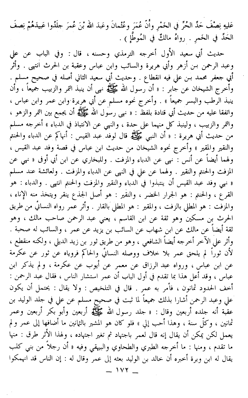 وَلِلْبُخَارِيِّ عَنْ ابْنِ أَبِي أَوْفَى «نَهَى عَنْ الْمُزَفَّتِ وَالْحَنْتَمِ وَالنَّقِيرِ» ، وَلَهُمَا عَنْ عَلِيٍّ فِي النَّهْيِ عَنْ الدُّبَّاءِ وَالْمُزَفَّتِ. وَلِعَائِشَةَ عِنْدِ مُسْلِمٍ «نَهَى وَفْدَ عَبْدِ الْقَيْسِ أَنْ يَنْتَبِذُوا فِي الدُّبَّاءِ وَالنَّقِيرِ وَالْمُزَفَّتِ وَالْحَنْتَمِ» انْتَهَى. وَالدُّبَّاءُ: هُوَ الْقَرْعُ، وَالْحَنْتَمُ: هُوَ الْجِرَارُ الْخُضْرُ، وَالنَّقِيرُ: هُوَ أَصْلُ الْجِذْعِ يُنْقَرُ وَيُتَّخَذُ مِنْهُ الْإِنَاءُ، وَالْمُزَفَّتُ: هُوَ الْمَطْلِيُّ بِالزِّفْتِ، وَالْمُقَيَّرُ: هُوَ الْمَطْلِيُّ بِالْقَارِ. وَأَثَرُ عُمَرَ رَوَاهُ النَّسَائِيّ مِنْ طَرِيقِ الْحَارِثِ بْنِ مِسْكِينٍ وَهُوَ ثِقَةٌ عَنْ ابْنِ الْقَاسِمِ، يَعْنِي عَبْدَ الرَّحْمَنِ صَاحِبَ مَالِكٍ، وَهُوَ ثِقَةٌ أَيْضًا عَنْ مَالِكٍ عَنْ ابْنِ شِهَابٍ عَنْ السَّائِبِ بْنِ يَزِيدَ عَنْ عُمَرَ، وَالسَّائِبُ لَهُ صُحْبَةٌ.