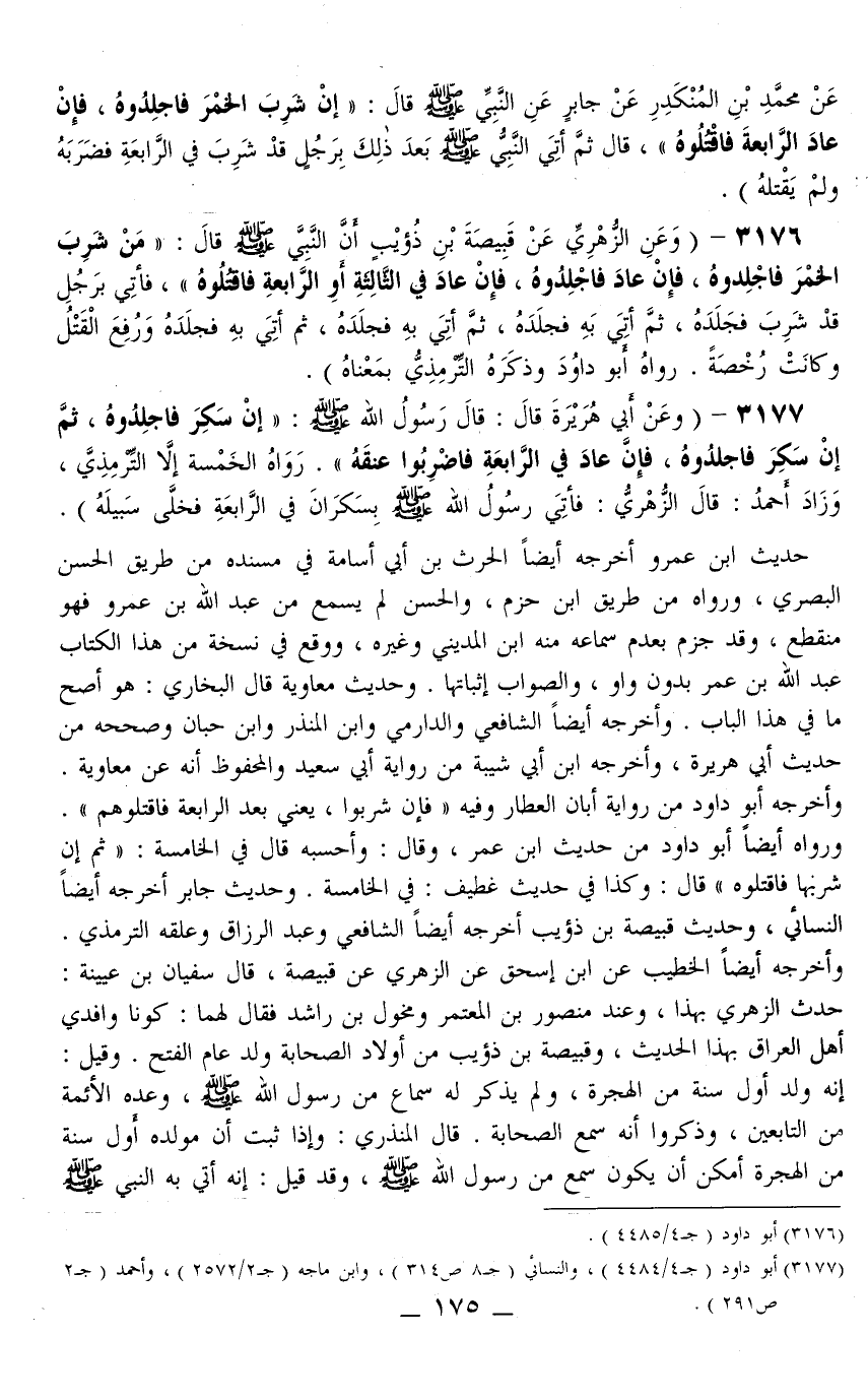 3177 - (وَعَنْ أَبِي هُرَيْرَةَ قَالَ: «قَالَ رَسُولُ اللَّهِ - صَلَّى اللَّهُ عَلَيْهِ وَسَلَّمَ -: إنْ سَكِرَ فَاجْلِدُوهُ، ثُمَّ إنْ سَكِرَ فَاجْلِدُوهُ، فَإِنْ عَادَ فِي الرَّابِعَةِ فَاضْرِبُوا عُنُقَهُ» . رَوَاهُ الْخَمْسَةُ إلَّا التِّرْمِذِيَّ، وَزَادَ أَحْمَدُ: قَالَ الزُّهْرِيُّ: «فَأُتِيَ رَسُولُ اللَّهِ - صَلَّى اللَّهُ عَلَيْهِ وَسَلَّمَ - بِسَكْرَانَ فِي الرَّابِعَةِ فَخَلَّى سَبِيلَهُ» .