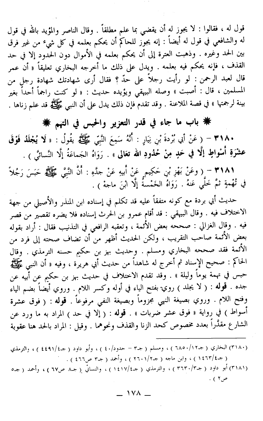 وَحَدِيثُ بَهْزِ بْنِ حَكِيمٍ حَسَّنَهُ التِّرْمِذِيُّ. وَقَالَ الْحَاكِمُ: صَحِيحُ الْإِسْنَادِ ثُمَّ أَخْرَجَ لَهُ شَاهِدًا مِنْ حَدِيثِ أَبِي هُرَيْرَةَ، وَفِيهِ «أَنَّ النَّبِيَّ - صَلَّى اللَّهُ عَلَيْهِ وَسَلَّمَ - حَبَسَ فِي تُهْمَةٍ يَوْمًا وَلَيْلَةً» . وَقَدْ تَقَدَّمَ الِاخْتِلَافُ فِي حَدِيثِ بَهْزِ بْنِ حَكِيمٍ عَنْ أَبِيهِ عَنْ جَدِّهِ. قَوْلُهُ: (لَا يُجْلَدُ) رُوِيَ بِفَتْحِ الْيَاءِ فِي أَوَّلِهِ وَكَسْرِ اللَّامِ.