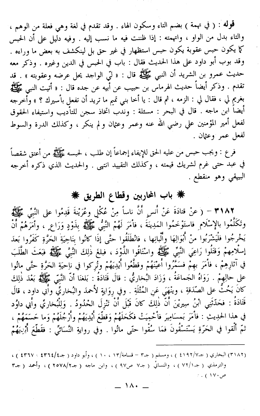 3182 - (عَنْ قَتَادَةَ عَنْ أَنَسٍ «أَنَّ نَاسًا مِنْ عُكْلٍ وَعُرَيْنَةَ قَدِمُوا عَلَى النَّبِيِّ - صَلَّى اللَّهُ عَلَيْهِ وَسَلَّمَ - وَتَكَلَّمُوا بِالْإِسْلَامِ فَاسْتَوْخَمُوا الْمَدِينَةَ، فَأَمَرَ لَهُمْ النَّبِيُّ - صَلَّى اللَّهُ عَلَيْهِ وَسَلَّمَ - بِذَوْدٍ وَرَاعٍ، وَأَمَرَهُمْ أَنْ يَخْرُجُوا فَلْيَشْرَبُوا مِنْ أَبْوَالِهَا وَأَلْبَانِهَا، فَانْطَلَقُوا حَتَّى إذَا كَانُوا بِنَاحِيَةِ الْحَرَّةِ كَفَرُوا بَعْدَ إسْلَامِهِمْ وَقَتَلُوا رَاعِيَ النَّبِيِّ - صَلَّى اللَّهُ عَلَيْهِ وَسَلَّمَ - وَاسْتَاقُوا الذَّوْدَ، فَبَلَغَ ذَلِكَ النَّبِيَّ - صَلَّى اللَّهُ عَلَيْهِ وَسَلَّمَ - فَبَعَثَ الطَّلَبَ فِي آثَارِهِمْ، فَأَمَرَ بِهِمْ فَسَمَرُوا أَعْيُنَهُمْ وَقَطَّعُوا أَيْدِيَهُمْ وَتُرِكُوا فِي نَاحِيَةِ الْحَرَّةِ حَتَّى مَاتُوا عَلَى حَالِهِمْ» . رَوَاهُ الْجَمَاعَةُ، وَزَادَ الْبُخَارِيُّ: قَالَ قَتَادَةُ: بَلَغَنَا أَنَّ النَّبِيَّ - صَلَّى اللَّهُ عَلَيْهِ وَسَلَّمَ - بَعْدَ ذَلِكَ كَانَ يَحُثُّ عَلَى الصَّدَقَةِ، وَيَنْهَى عَنْ الْمُثْلَةِ.