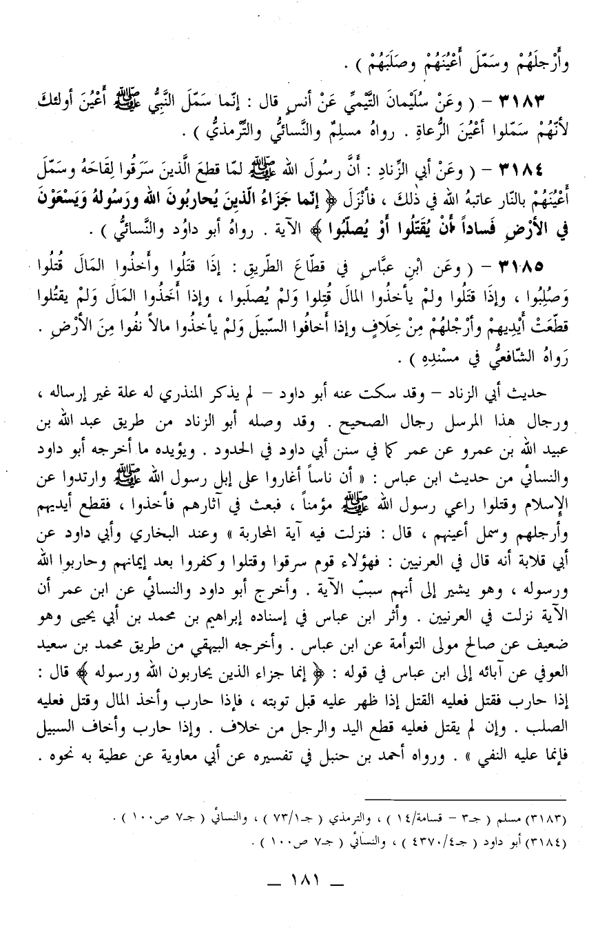 3184 - (وَعَنْ أَبِي الزِّنَادِ: «أَنَّ رَسُولَ اللَّهِ - صَلَّى اللَّهُ عَلَيْهِ وَسَلَّمَ - لَمَّا قَطَعَ الَّذِينَ سَرَقُوا لِقَاحَهُ وَسَمَلَ أَعْيُنَهُمْ بِالنَّارِ عَاتَبَهُ اللَّهُ فِي ذَلِكَ، فَأَنْزَلَ {إِنَّمَا جَزَاءُ الَّذِينَ يُحَارِبُونَ اللَّهَ وَرَسُولَهُ وَيَسْعَوْنَ فِي الأَرْضِ فَسَادًا أَنْ يُقَتَّلُوا أَوْ يُصَلَّبُوا} [المائدة: 33] الْآيَةَ» . رَوَاهُ أَبُو دَاوُد وَالنَّسَائِيُّ) .